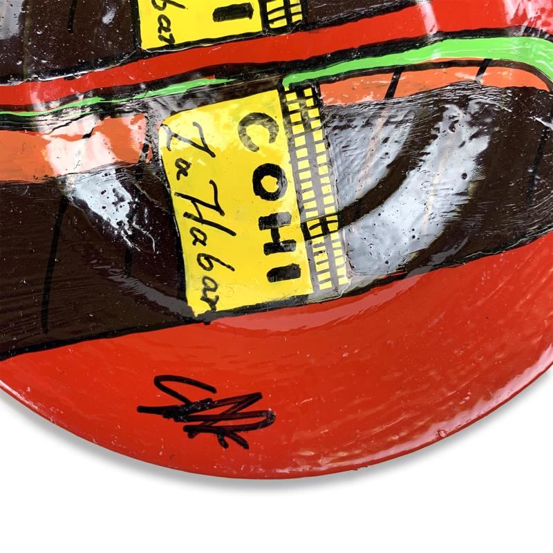 "COHIBA" is a hand painted plate by Steve Kaufman (1960-2010). This piece is hand signed by the artist and includes a letter of authenticity. As is common with Kaufman's works, this piece may have perceived minor flaws, but is in overall good condition. Measures approximately 5.75" (diameter).