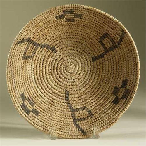 BASKETRY: Coiled Pima/Papago shallow grain basket, inset alternating geometric square based designs, 10.5'' x 2.5''.