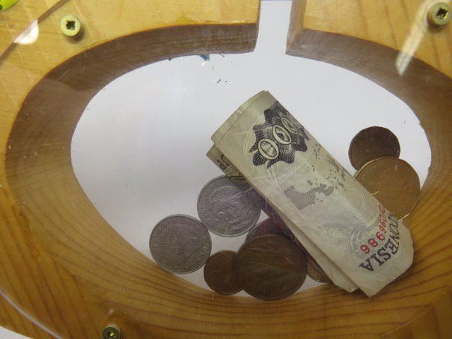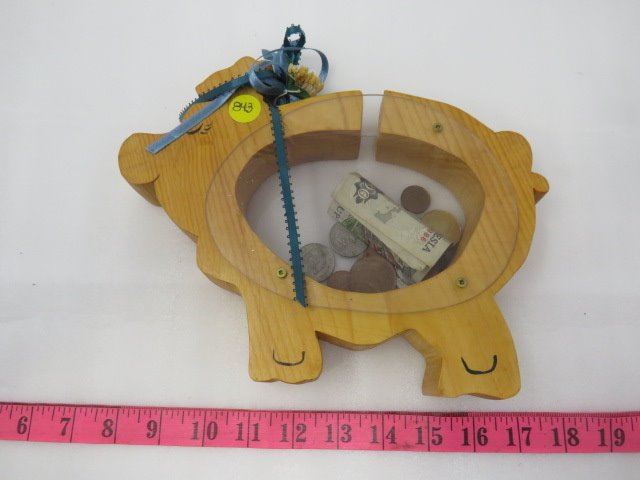 COIN BANK WITH CANADIAN AND INDONESIAN CURRENCY (WOOD PIG)