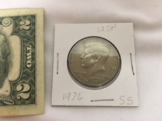 USA, 1976, LIBERTY HALF DOLLAR COIN, 2 DOLLAR BILL