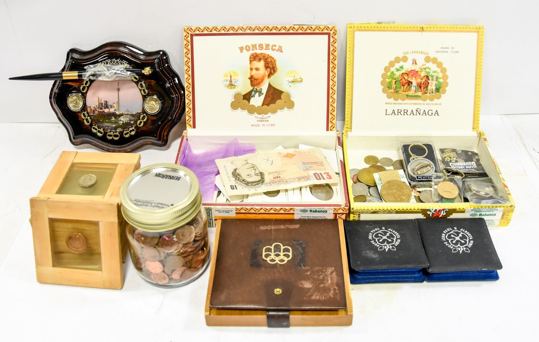 1922,1924,1927,1928,1929 W/MASON JAR OF OLD PENNIES, WORLD COINS GERMANY ETC. W/2 POPE JOHN PAUL II 1984 MEDALLIONS & 1998 MCDONALDS TEAM CANADA OLYMPICS INCLUDING WAYNE GRETZKY IN CIGAR BOX'S & MORE