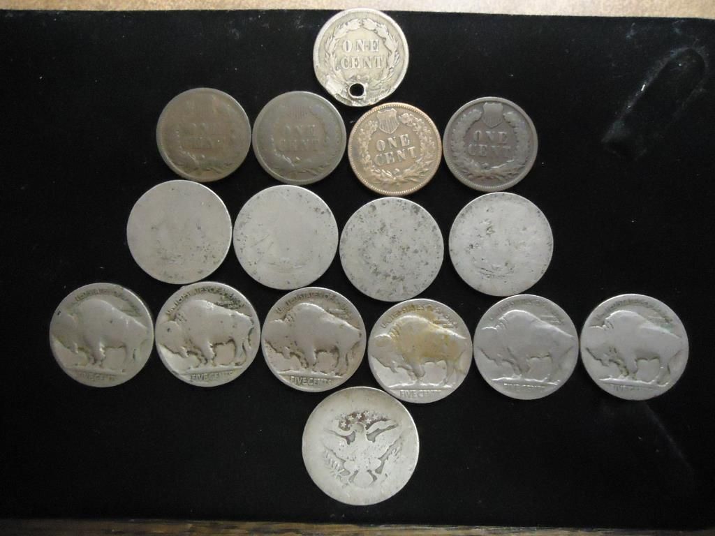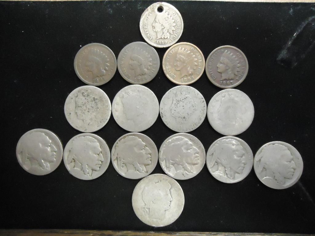 INDIAN HEAD CENTS, 1859 HOLED, 1891, 1885, 1893 & 1897, 4-DATELESS LIBERTY "V" NICKELS, 6- DATELESS BUFFALO NICKELS AND NEAR NO DATE BARBER QUARTERS