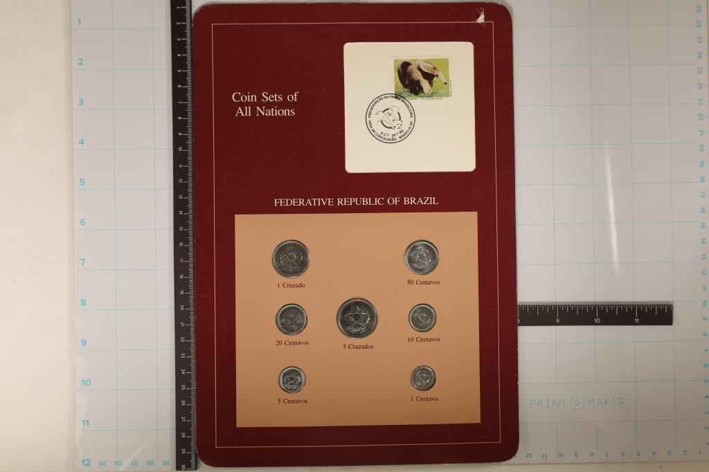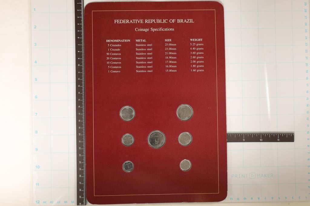 BRAZIL", 7 COIN BRILLIANT UNC SET ON MAROON CARDBOARD WITH CANCELLED STAMP