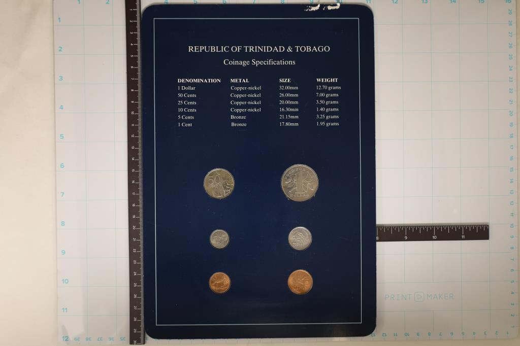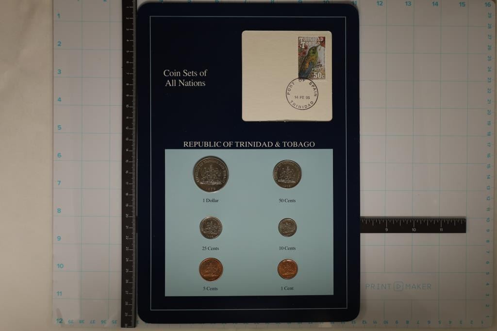TOBAGO", 6 COIN BRILLIANT UNC SET ON BLUE CARDBOARD WITH CANCELLED STAMP