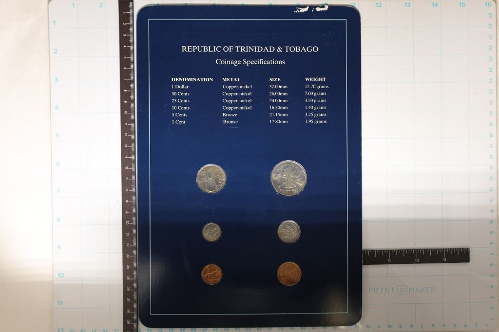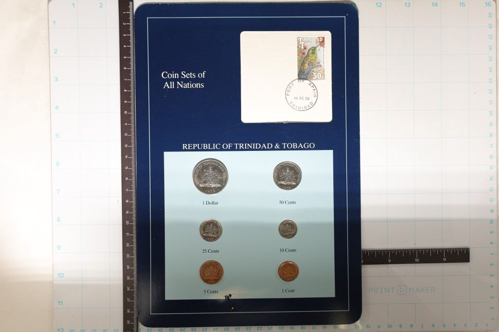 AND TOBAGO", 6 COIN BRILLIANT UNC SET ON BLUE CARDBOARD WITH CANCELLED STAMP