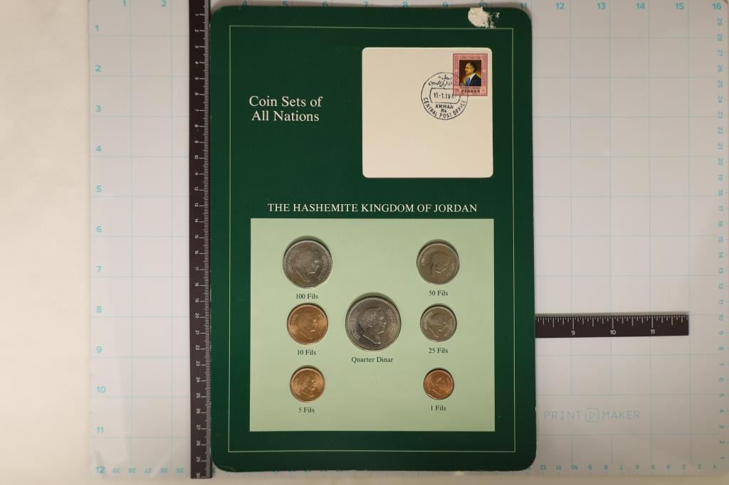 OF JORDAN", 7 COIN UNC SET ON GREEN CARDBOARD CARD WITH CANCELLED STAMP