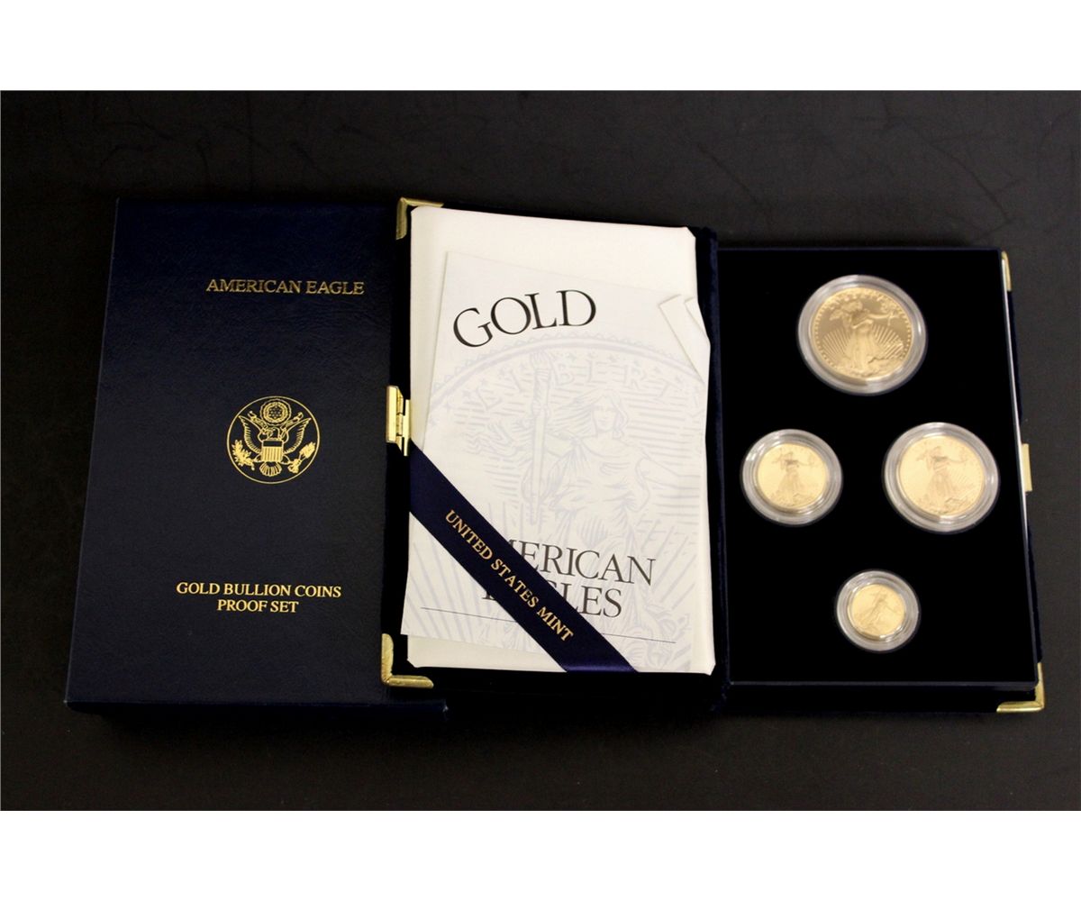 COINS: [1] Boxed American Eagle gold bullion proof set; Contains 1- U.S. $50 1 oz gold coin, 1- U.S. $25 0.5 oz gold coin, 1- U.S. $10 0.25 oz gold coin, 1- U.S. $5 0.10 gold coin, Fine Gold, 2002.