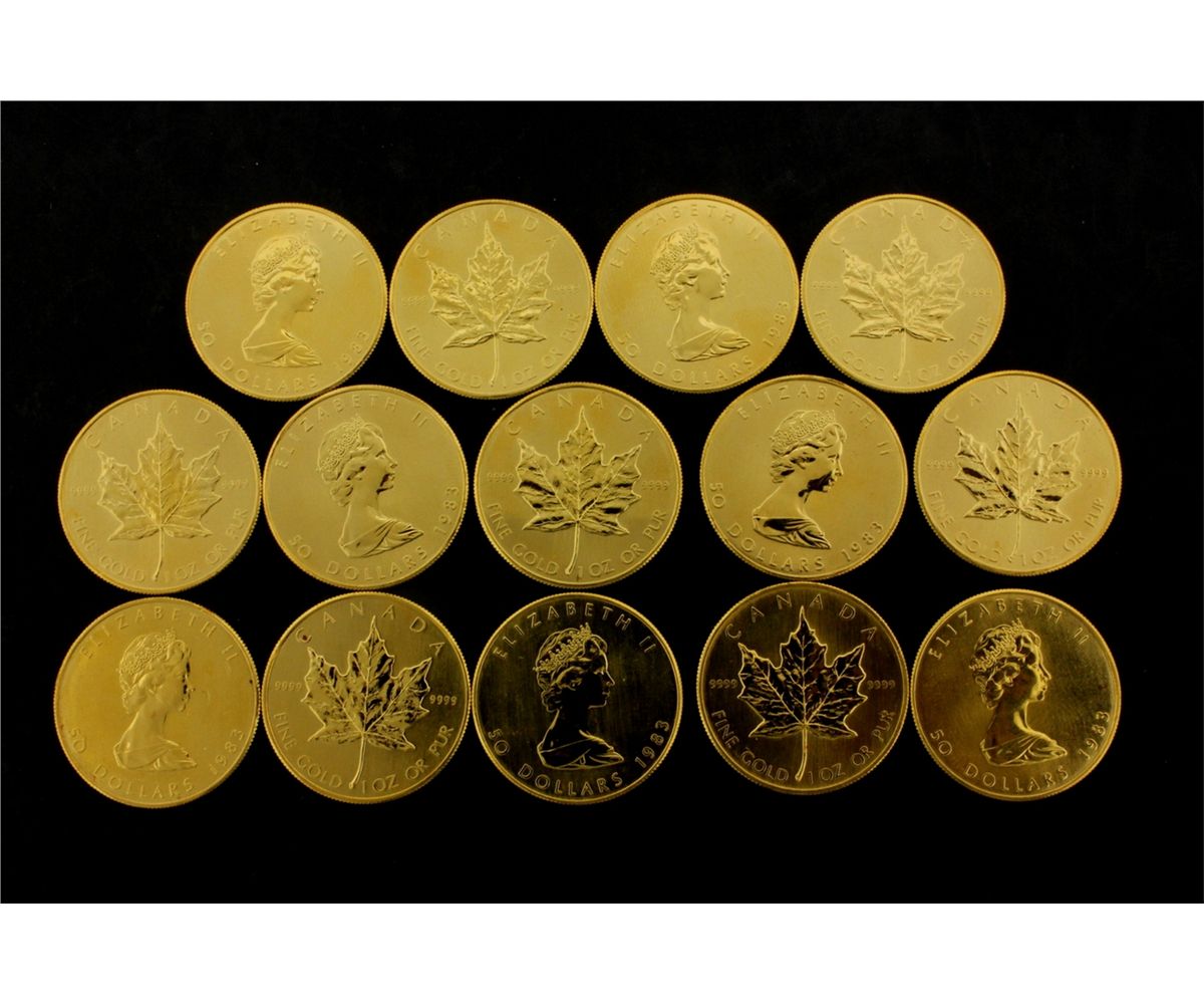 COINS: [14] $50 Canadian Maple Leaf gold coins, .9999, 1 Troy oz, 1983.