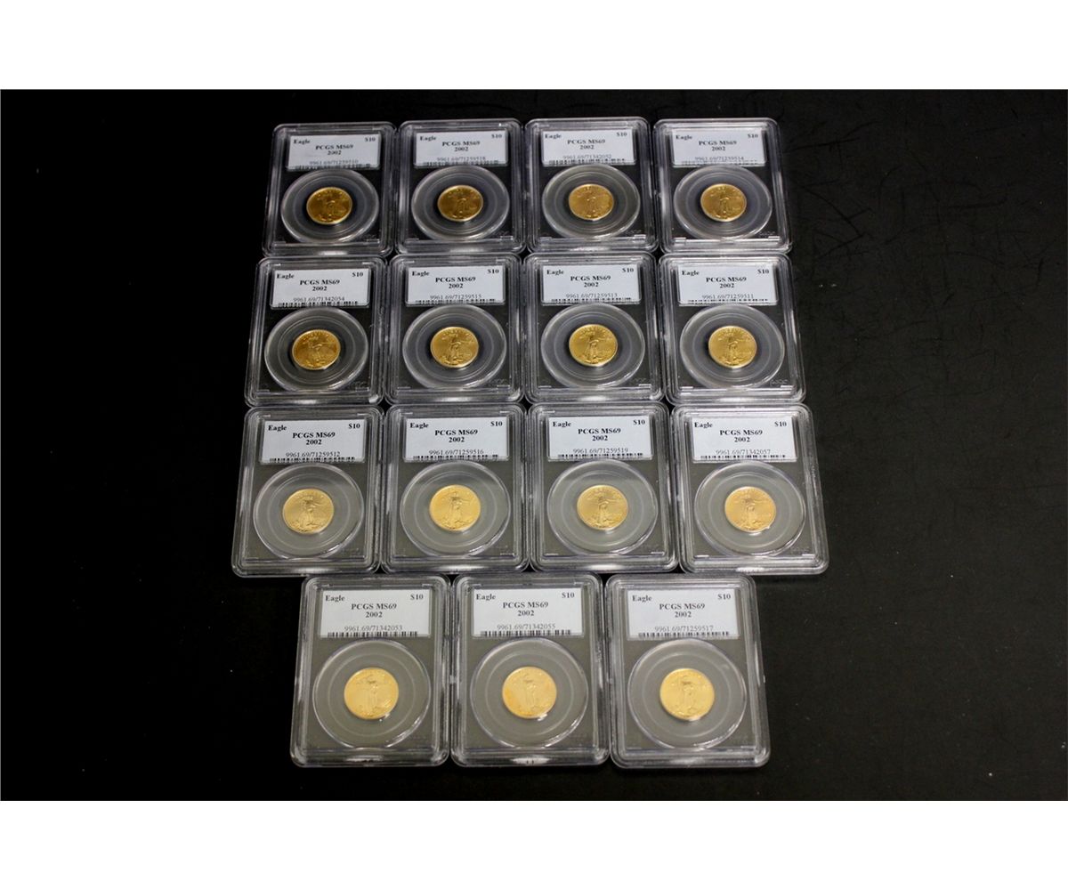 COINS: [15] $10 American Eagle gold coins, 1/4 oz, slabbed and graded PCGS MS69, 2002