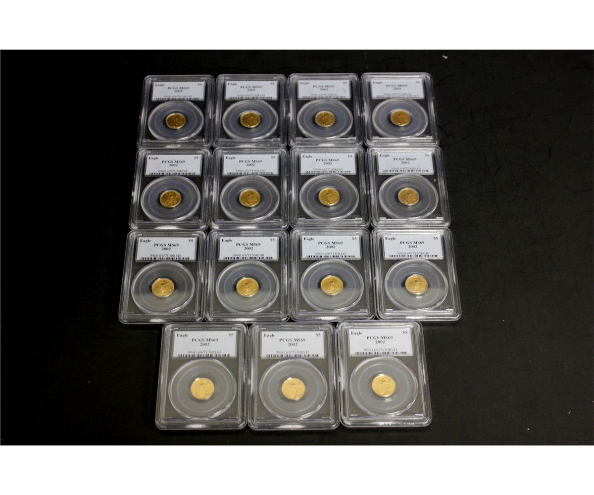 COINS: [15] $5 American Eagle gold coins, 1/10 oz, slabbed and graded PCGS MS69, 2002