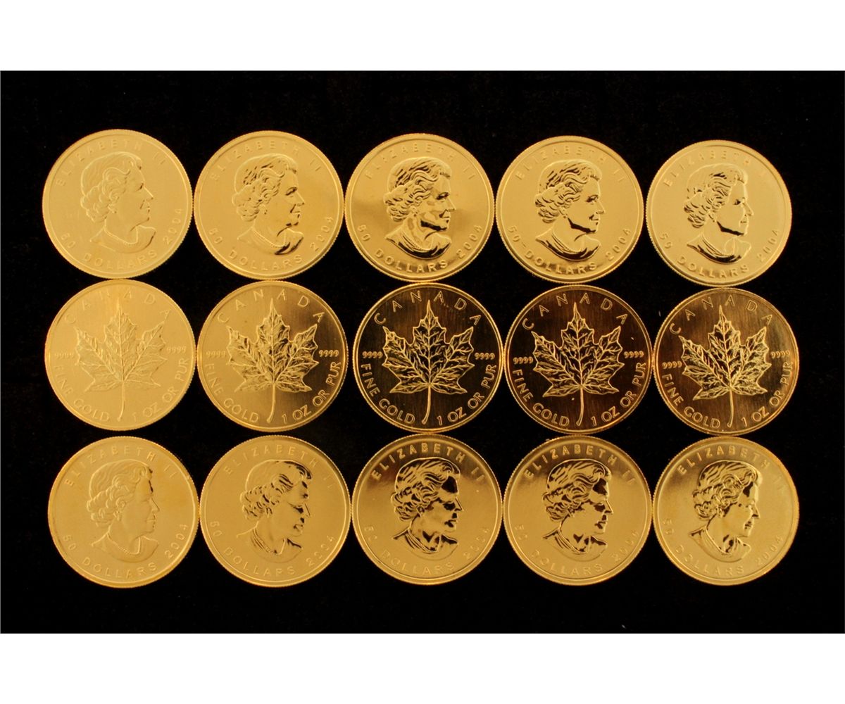 COINS: [15] $50 Canadian Maple Leaf gold coins, .9999, 1 Troy oz, 2004.