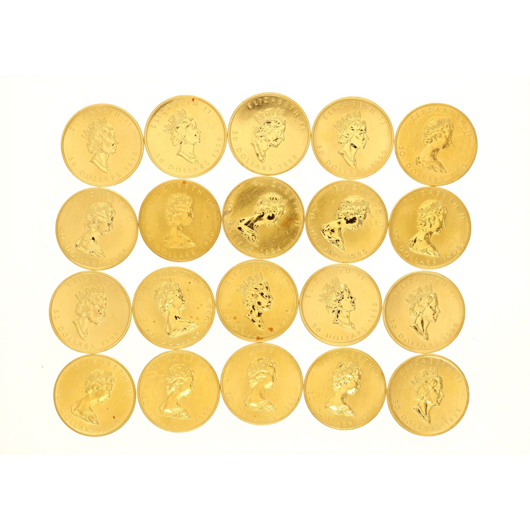 COINS: [20] Canadian Gold Maple Leaf fifty dollar 1 ounce (.999) fine gold coins; [assorted dates]