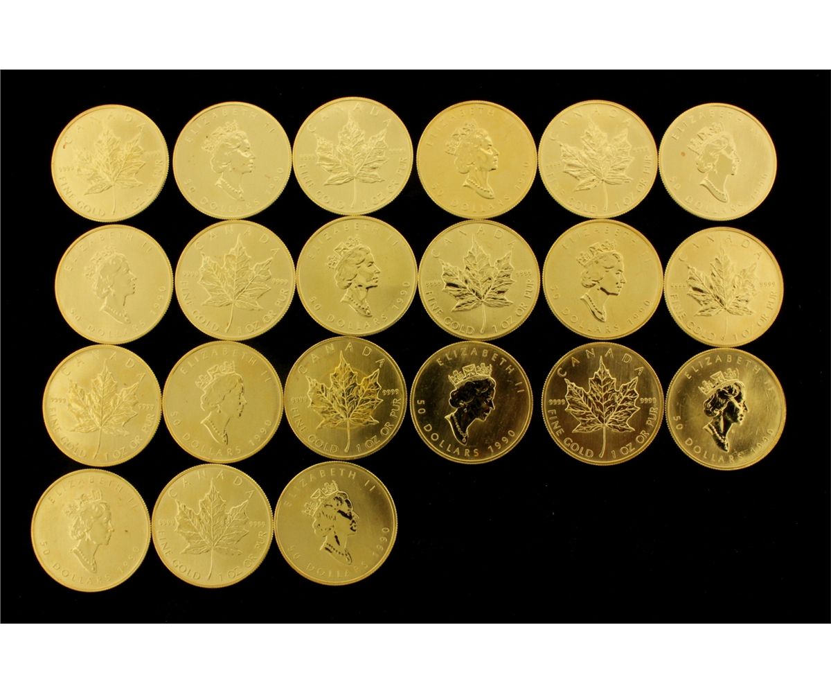 COINS: [21] $50 Canadian Maple Leaf gold coins, .9999, 1 Troy oz, 1990.