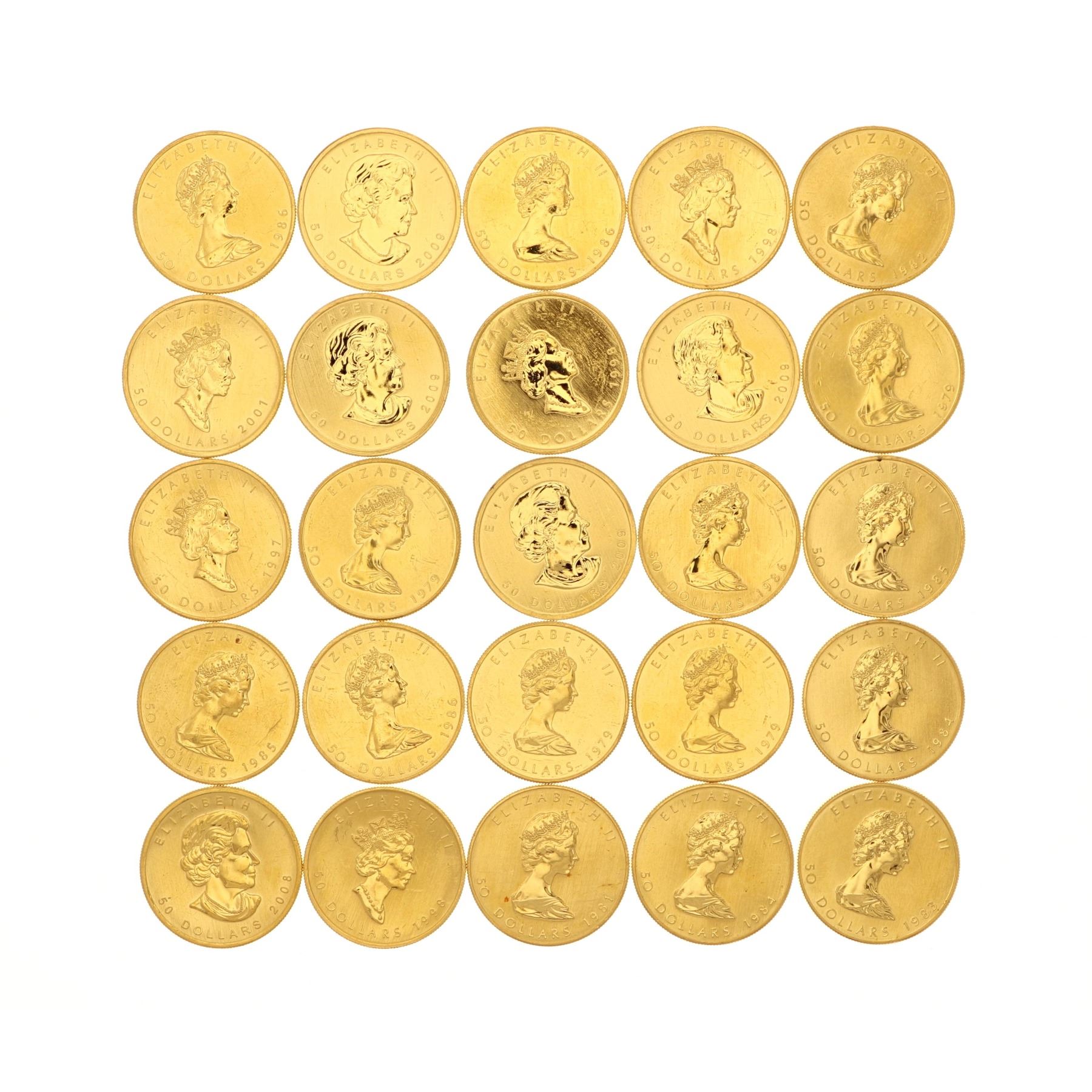 COINS: [25] Canadian Gold Maple Leaf fifty dollar 1 ounce (.999) fine gold coins; [assorted dates]