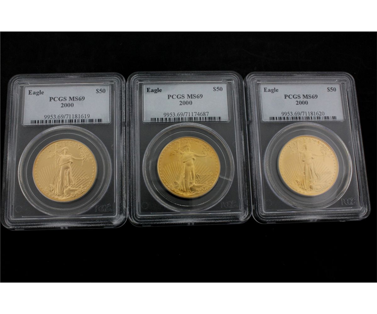 COINS: [3] $50 American Eagle gold coins, 1 oz, slabbed and graded PCGS MS69, 2000.