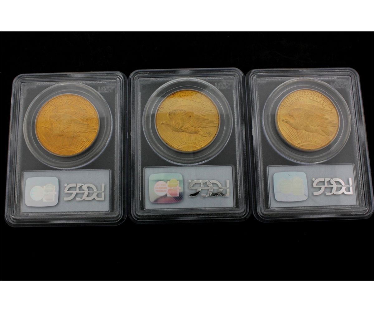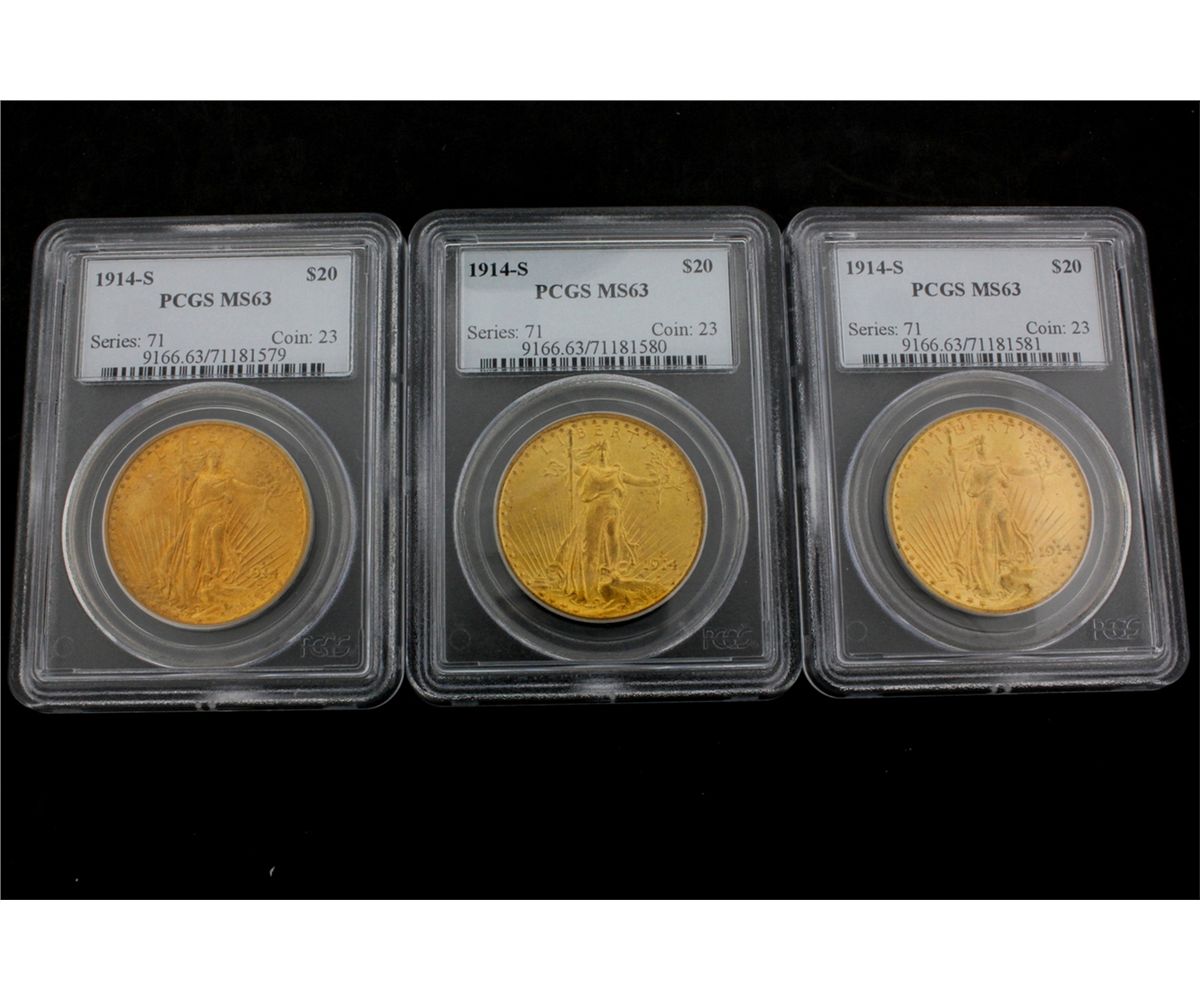 COINS: [3] U.S. $20 gold coins, 1914-S, graded and slabbed PCGS MS63.