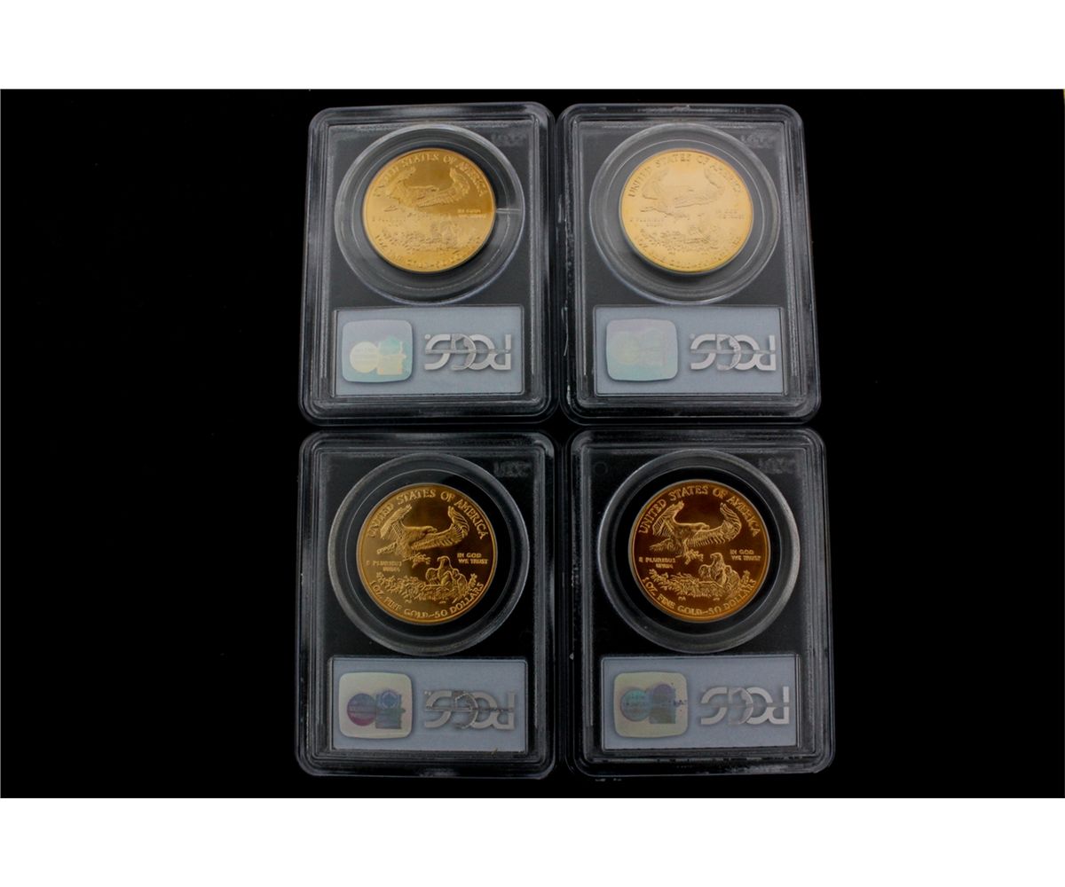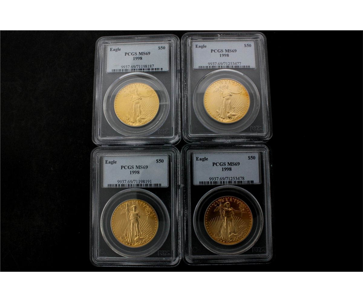 COINS: [4] $50 American Eagle gold coins, 1 oz, slabbed and graded PCGS MS69, 1998