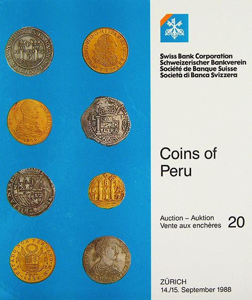 Schweizerischer Bankverein. COINS OF PERU. Zürich, Sept. 14-15, 1988. Square 8vo, original pictorial boards. 220, (4) pages including 4 color plates; 1356 lots; illustrated throughout. PRL. Fine. The extremely important catalogue of the Sellschop collection of coins of Peru.
