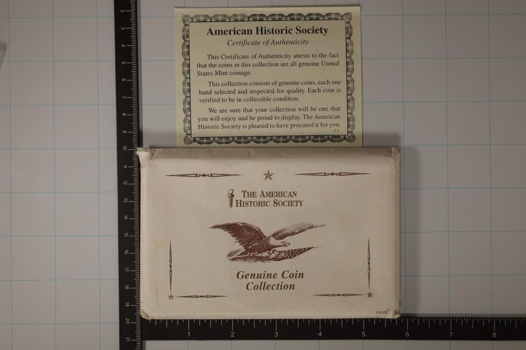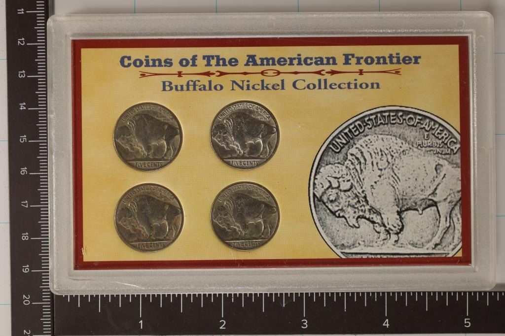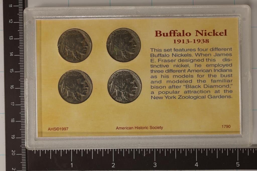 NICKEL COLLECTION, 1930, 1935, 1936 & 1937 FULL DATE NICKELS, IN HARD PLASTIC CASE WITH CERTIFICATE BY THE AMERICAN HISTORIC SOCIETY