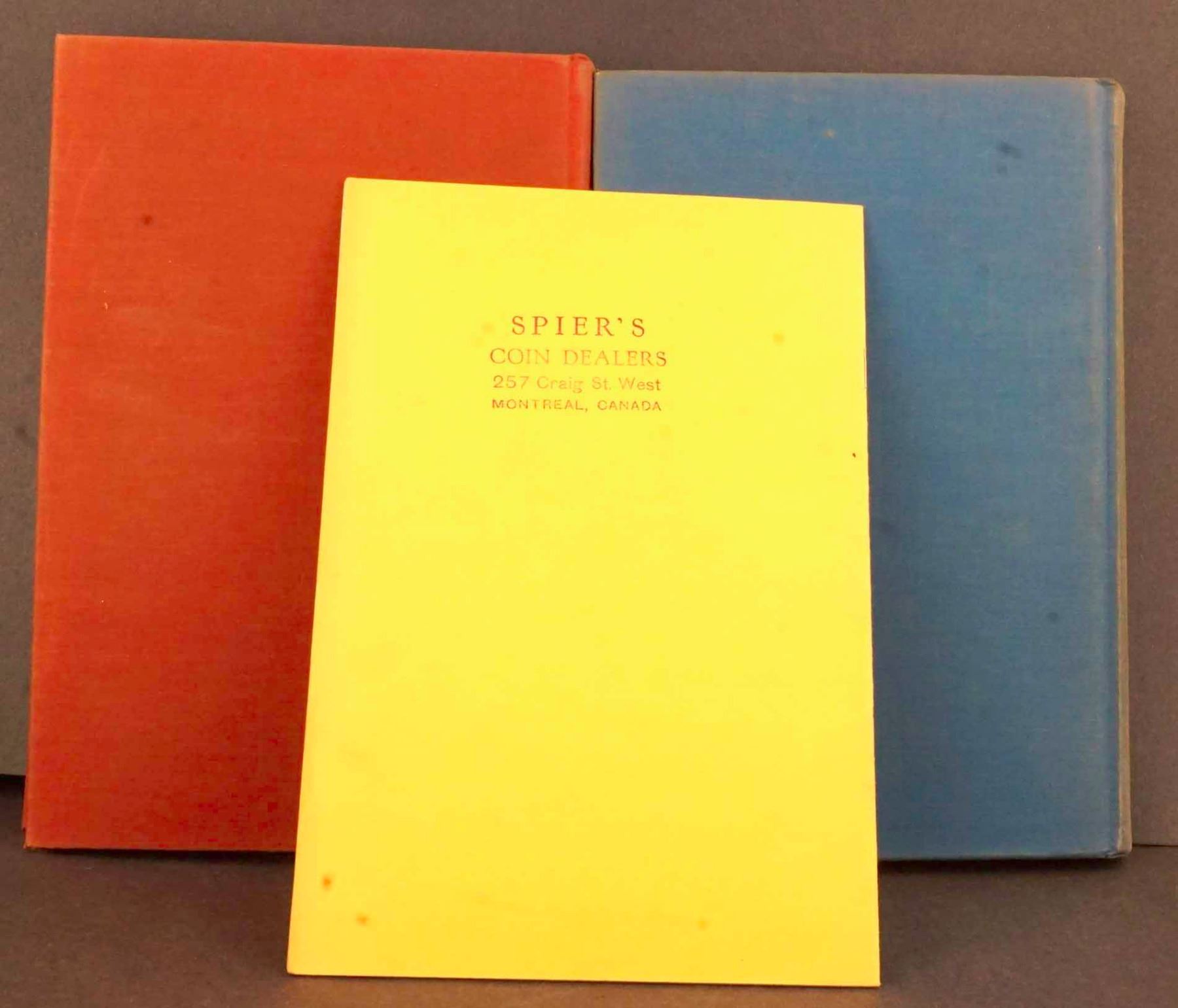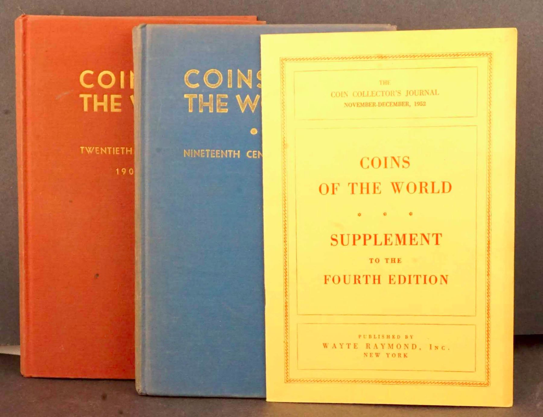 COINS OF THE WORLD edited by WAYTE RAYMOND in Two Volumes, plus Supplement 1) Nineteenth Century Issues - First Edition 1947. Bound in blue cloth, very faded on the spine. 252 pages lavishly illustrated. On first inside page, on top : NOT FOR SALE. 2) Twentieth Century issues 1901 - 1950 Fourth Edition 1951. 296 pages. Also included is a 16 page pamphlet : SUPPLEMENT to the FOURTH EDITION (1953). Bound in yellow cardboard. In excellent condition. On the reverse, the stamp of SPIER'S COIN DEALERS, MONTREAL.