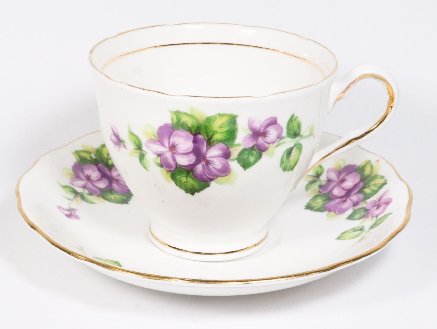 COLCLOUGH PURPLE FLOWER PATTERN TEACUP AND SAUCER
