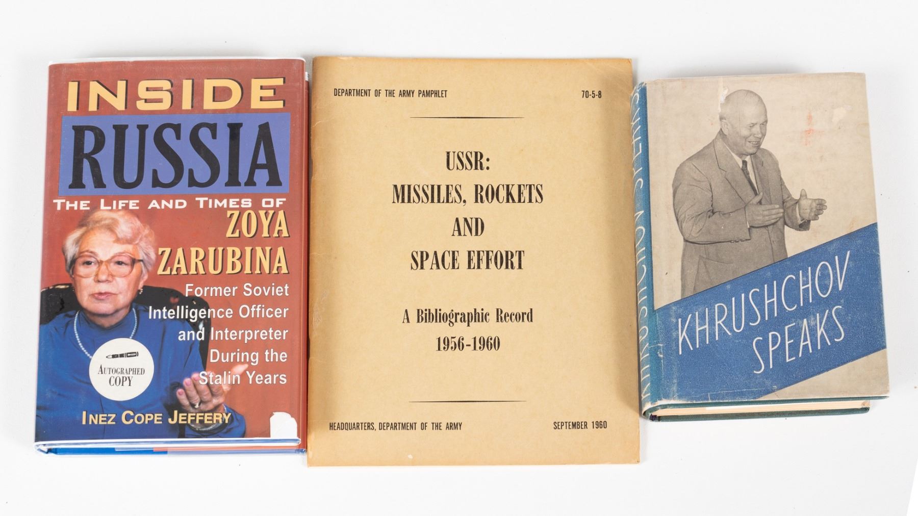 Lot of three books about the USSR, includes Dept of the Army pamphlet 70-5-8 USSR: Missiles, Rockets and Space Efforts 1956-1960; Khrushchov Speaks; and a signed copy of Inside Russia by former Soviet Intelligence officer Zoya Zarubina.