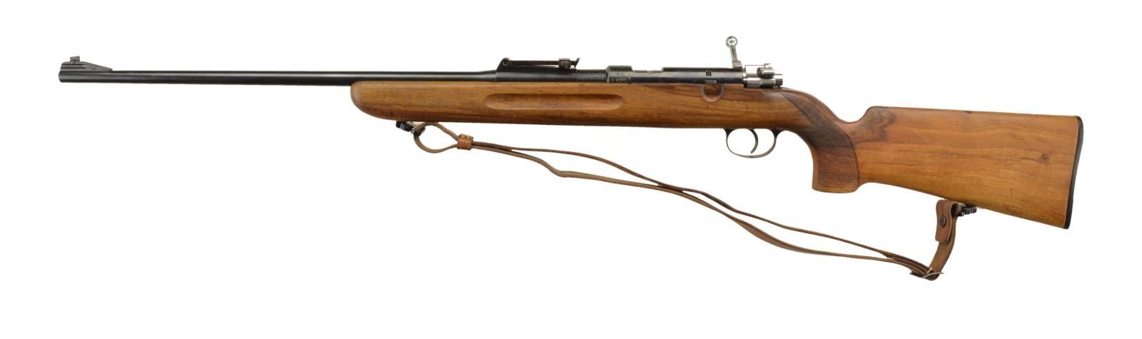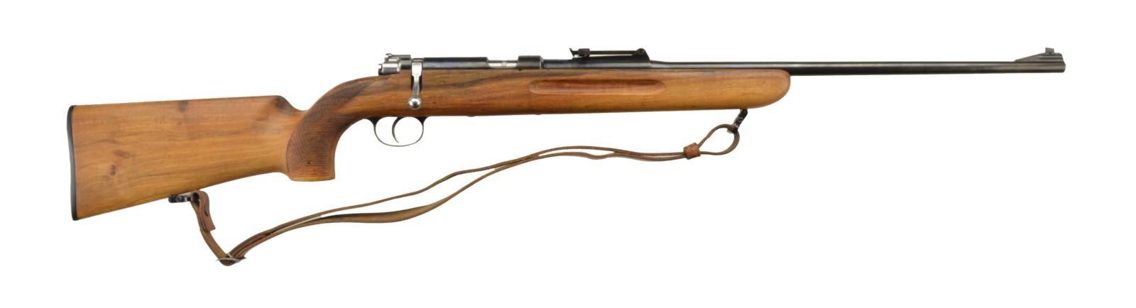 BOLT ACTION TRAINING RIFLE. Cal. 22 LR. S# K3385. CAI import marked 24" bbl. w/ ramp mounted blade front sight & 200m tangent rear sight. Matted top of receiver. Hardwood checkered pistol grip stock w/ plastic buttplate & grasping grooves. Brown leather sling on QD swivels & studs. CONDITION: very good reblued metal finish. Very good stock finish. Very good bore. (22-2366/MD). CURIO. $200-400.