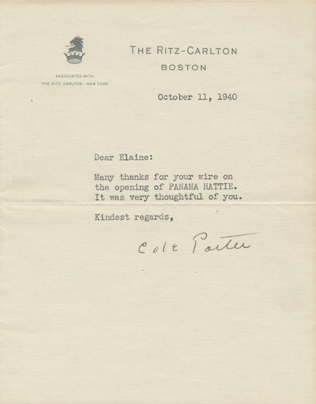 (1891 - 1964) American composer and lyricist of the classic musicals Anything Goes, Kiss Me Kate, and Can-Can. T.L.S. 1p. 8vo., Boston, Oct. 11, 1940, a brief letter to "Elaine" thanking her for her wire on the opening of "Panama Hattie". Boldly signed in full. Simply framed, very good.