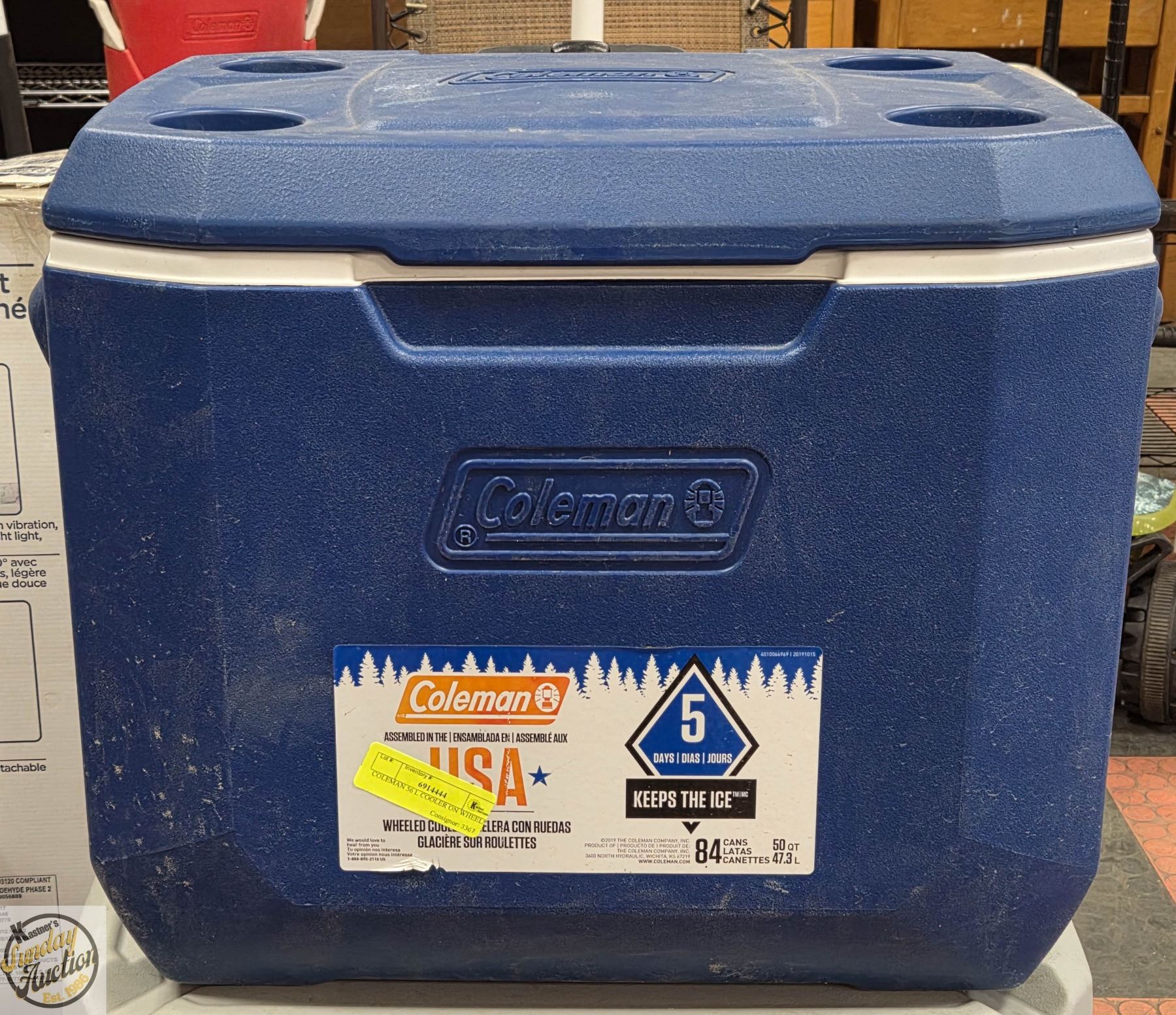 COLEMAN 56 L COOLER ON WHEELS **ALL ITEMS MUST BE REMOVED BY 5PM SATURDAY, MAY 10TH 2025. ALL REMAINING ITEMS WILL BE SUBJECT TO A $6.00 PER DAY STORAGE CHARGE. ANY ITEMS REMAINING AFTER MONDAY, MAY 26TH 2025 WILL BE CONSIDERED FORFEITED. NO REFUNDS WILL BE ISSUED FOR FORFEITED ITEMS. TO SCHEDULE A PICK UP APPOINTMENT CLICK HERE