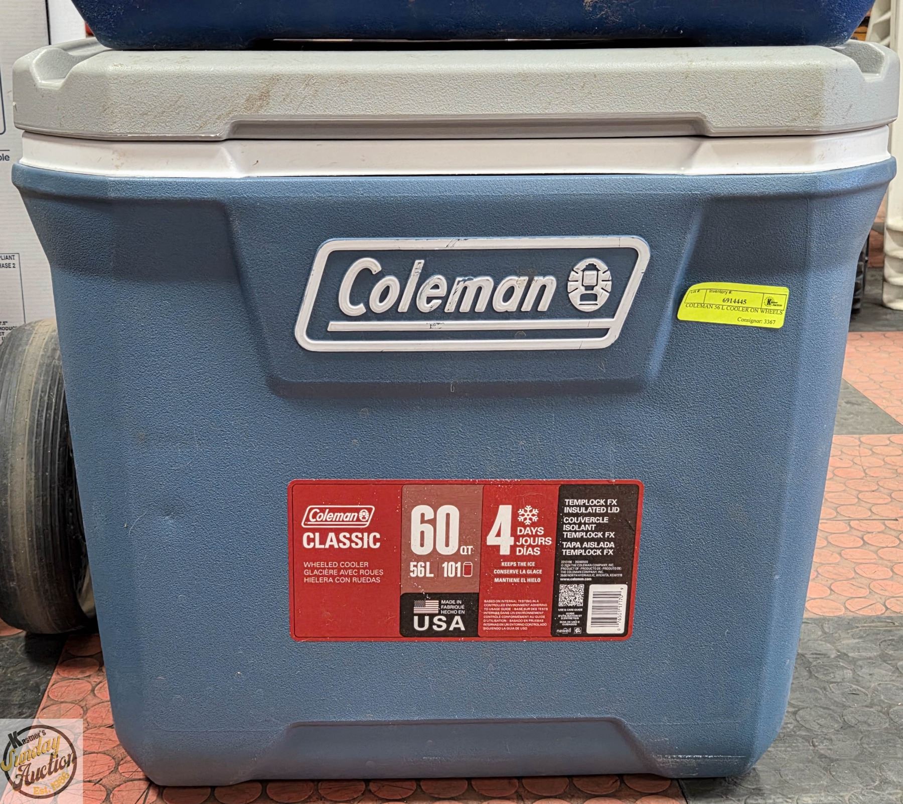 COLEMAN 56 L COOLER ON WHEELS **ALL ITEMS MUST BE REMOVED BY 5PM SATURDAY, MAY 10TH 2025. ALL REMAINING ITEMS WILL BE SUBJECT TO A $6.00 PER DAY STORAGE CHARGE. ANY ITEMS REMAINING AFTER MONDAY, MAY 26TH 2025 WILL BE CONSIDERED FORFEITED. NO REFUNDS WILL BE ISSUED FOR FORFEITED ITEMS. TO SCHEDULE A PICK UP APPOINTMENT CLICK HERE