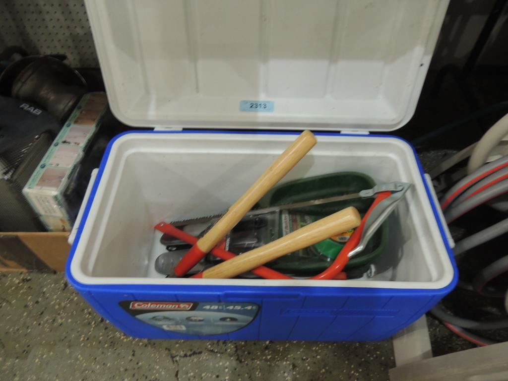 COLEMAN 48 QTS COOLER, BLACK & DECKER CUTTER, SHOVELS, SAW TRIMMER LINE, YARD EQUIPMENT, AS SHOWN SEE PHOTO FOR MORE DETAILS