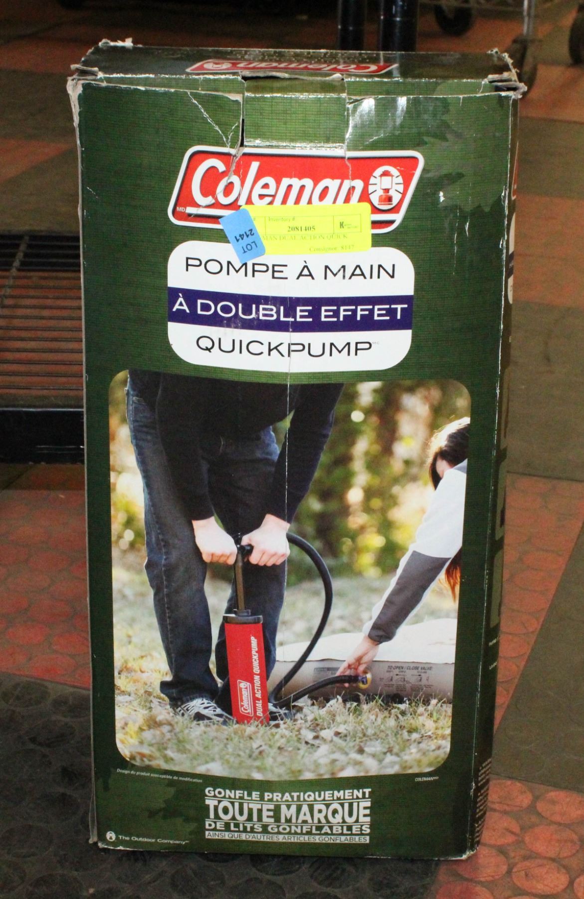 COLEMAN DUAL ACTION QUICK PUMP HAND PUMP, NOZZLE ADAPTORS INCLUDED **ALL ITEMS MUST BE REMOVED BY 5PM SATURDAY, JULY 26th 2025. ALL REMAINING ITEMS WILL BE SUBJECT TO A $6.00 PER DAY STORAGE CHARGE. ANY ITEMS REMAINING AFTER MONDAY, AUGUST 11TH 2025 WILL BE CONSIDERED FORFEITED. NO REFUNDS WILL BE ISSUED FOR FORFEITED ITEMS. TO SCHEDULE A PICK UP APPOINTMENT CLICK HERE