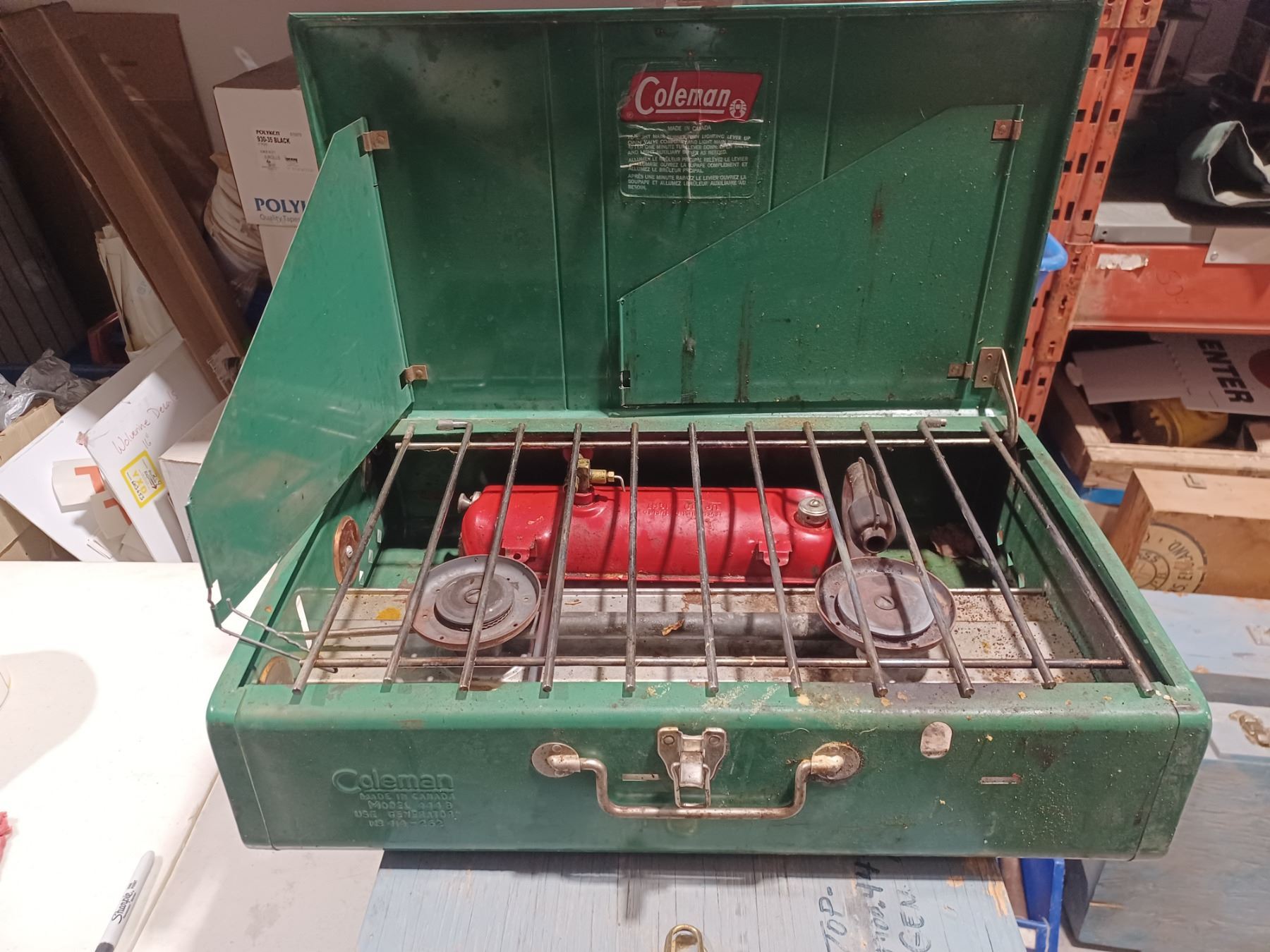 COLEMAN, LARGE TWO BURNER STOVE IN PLYWOOD CASE