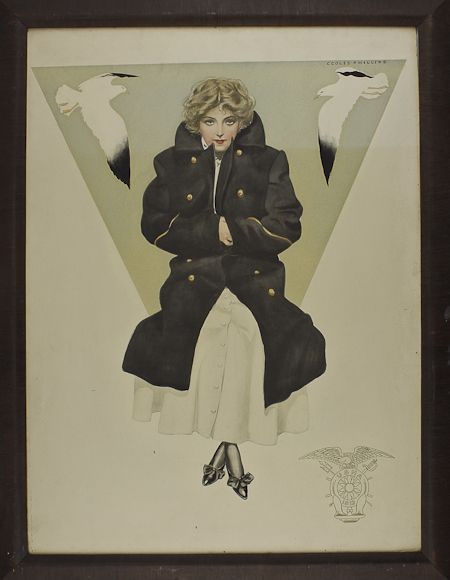 (1880 - 1927) American artist and illustrator. In 1907, Phillips met with J. A. Mitchell, the publisher of Life magazine, and was hired onto its staff. Phillips would be associated with the magazine throughout his life. The work of Phillips quickly became popular with Life's readers. In May 1908, he created a cover for the magazine that featured his first "fadeaway girl": a figure whose clothing matched, and disappeared into, the background. Phillips developed this idea in many subsequent covers. Phillips' use of negative space allowed the viewer to "fill-in" the image. Phillips also produced cover art for Good Housekeeping, and advertising images. His works also appear in the 1921 and 1922 editions of the U. S. Naval Academy yearbook, Lucky Bag. An original Phillips piece, the printed outline of one of his most famous images, "Midshipmite", hand-colored by Phillips, 20 1/2" x 27 1/2" (sight), framed, and recovered from his home in New Rochelle, NY. The image, known to every fan of Phillips' work, depicts a demure young lady wrapped in an oversized sailor's great coat, offset by her petite feet crossed at the bottom. Her figure is framed by an inverted sea-green triangle in the background with two seagulls facing each other at top, signed "C. COLES PHILLIPS" at upper-right. At lower-right appears the seal of the U.S. Naval Academy, with the year of the publication of this image, "1912". There is no mistaking that this is a hand-colored image, and not a lithograph or other totally reproduced image. This piece was discovered in the Phillips' home in New Rochelle, New York where he died of tuberculosis at the age of 47. In 2010 our consignor, an art appraiser with fifty years' experience, was asked to appraise and receive on consignment various Phillips works which were owned by an elderly lady who had purchased Phillips home after his demise. Six original Phillips illustrations were consigned to him, along with three oil paintings by other artists which we believe are portrayals of Phillips' brother, sister and father. The three oil paintings (only) are included in the lot, though in rough, damaged condition. "Midshipmite" is in far better condition: is does bear some slightly uneven toning below and to the right of the lady's neckline -- we presume this is due to the effects of some exposure to sunlight and perhaps a competent art restorer could lessen this effect. Besides the above, this image bears two tiny specks near the bottom but is in otherwise fine condition. This image may have been used by Phillips as the "original" from which all other color images have emanated. With notarized letter of provenance from the art appraiser, our consignor.