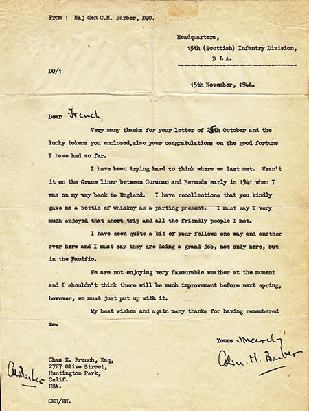 (1897 - 1964) British General who commanded the 15th (Scottish) Division in northwest Europe which had the distinction to lead the three great river crossings of the Seine, the Rhine and the Elbe. War-date T.L.S., 1p. 4to., "Headquarters, 15th Scottish Infantry Division", Nov. 15, 1944 to a friend: "...Very many thanks for...your congratulations on the good fortune I have had so far...I have recollections that you gave me a bottle of whiskey as a parting present...I have seen quite a bit of your fellows...they are doing a grand job, not only here, but in the Pacific...". Very good.