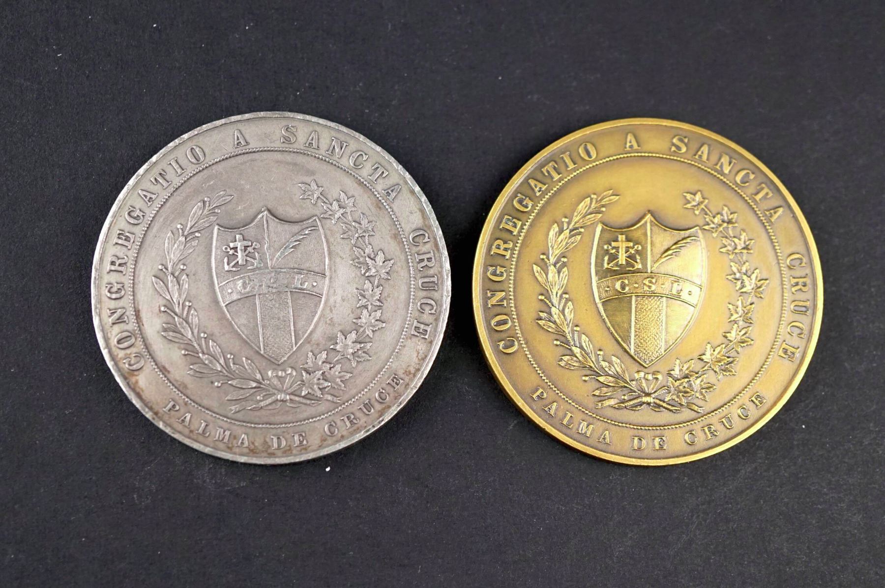 COLLEGIUM DE SANCTI LAURENTII Scene of the College at center. Signed below: CARON Montréal. Reverse: CONGREGATIO A SANCTA CRUCE. Below: PALMA DE CRUCE A crest at center, surrounded by a wreath. The common diameter is 46 mm. One is white metal, EF-AU, weighing 30.9 grams. The other is bronze, AU-UNC and weighs 27.3 grams.