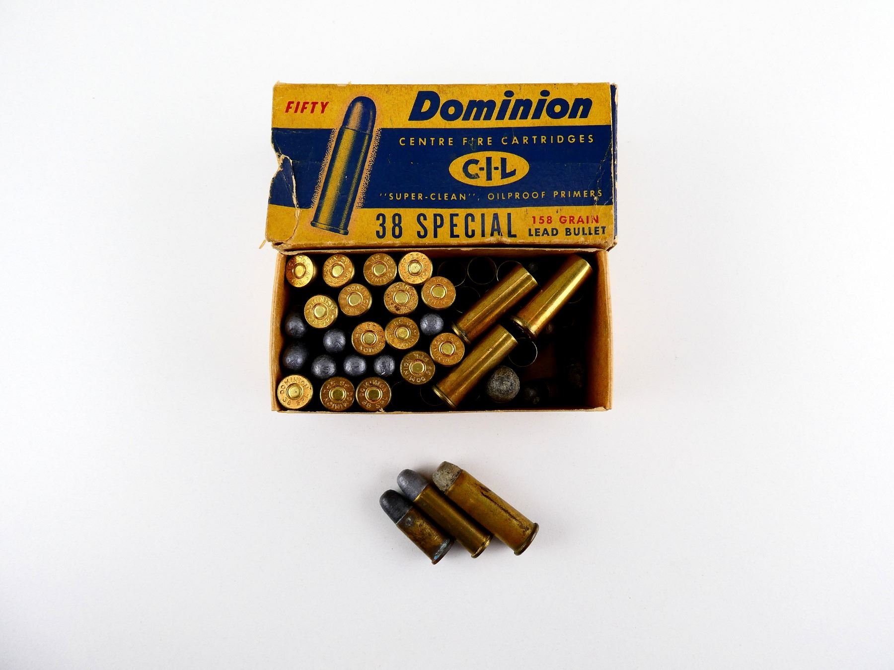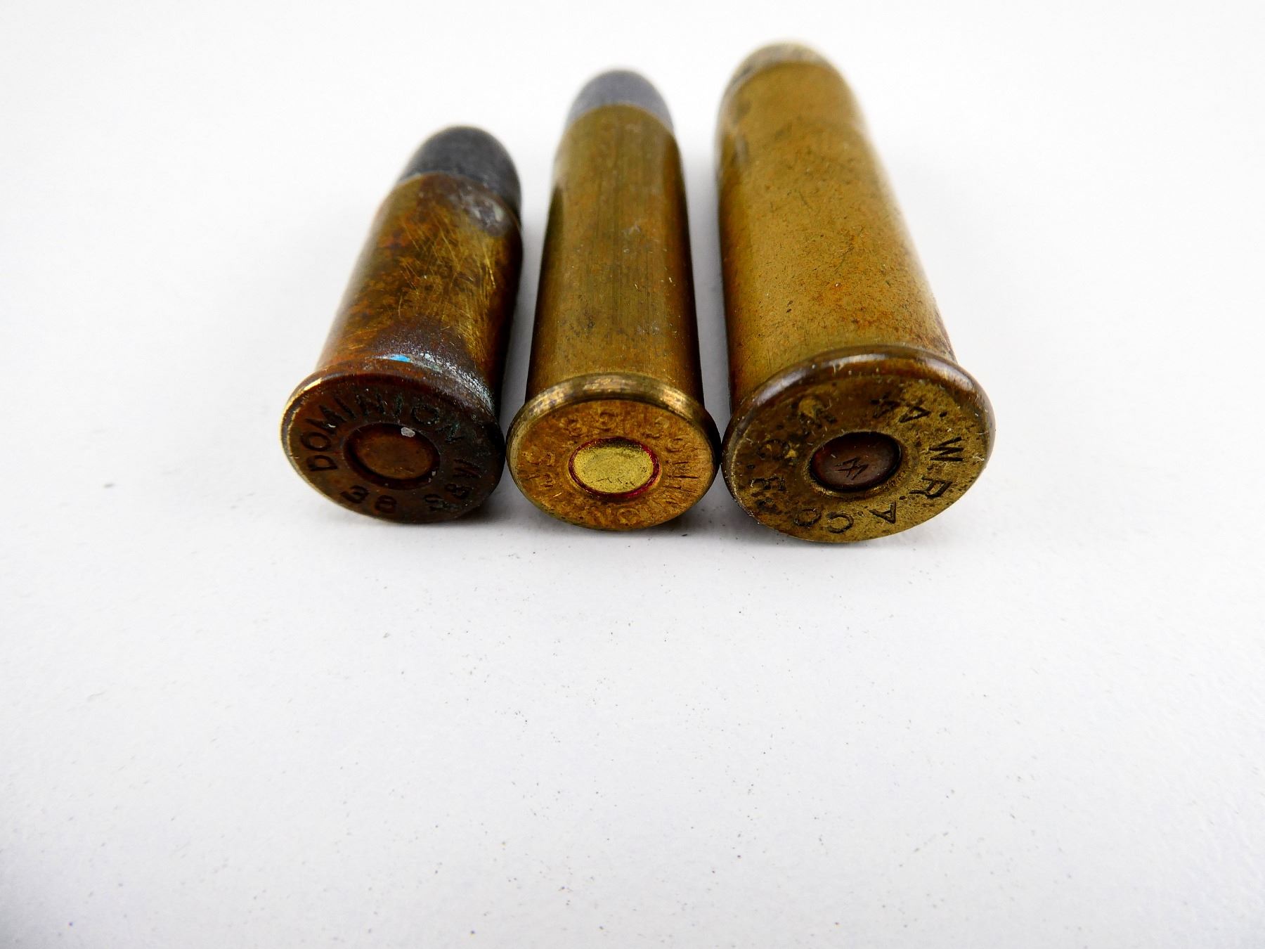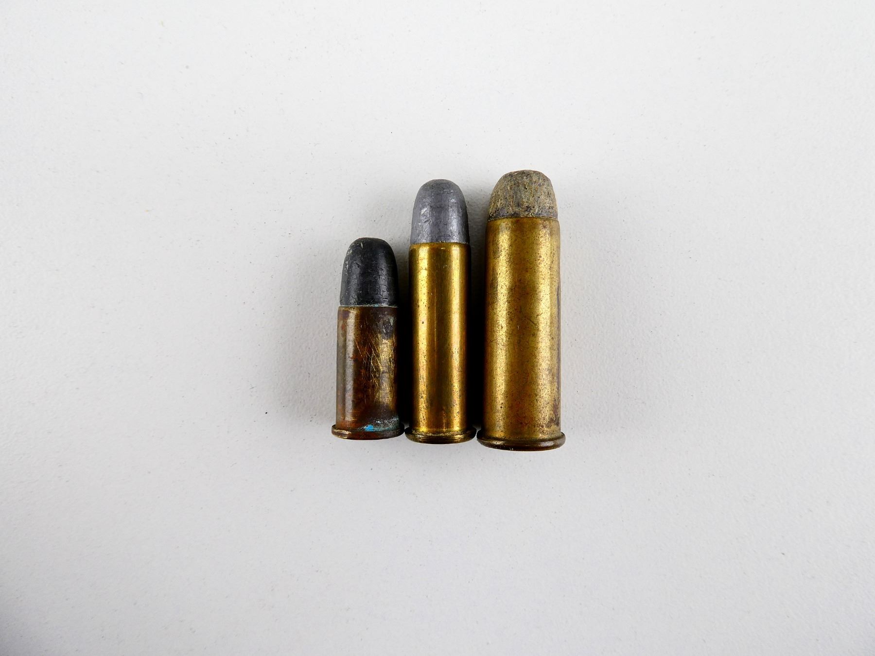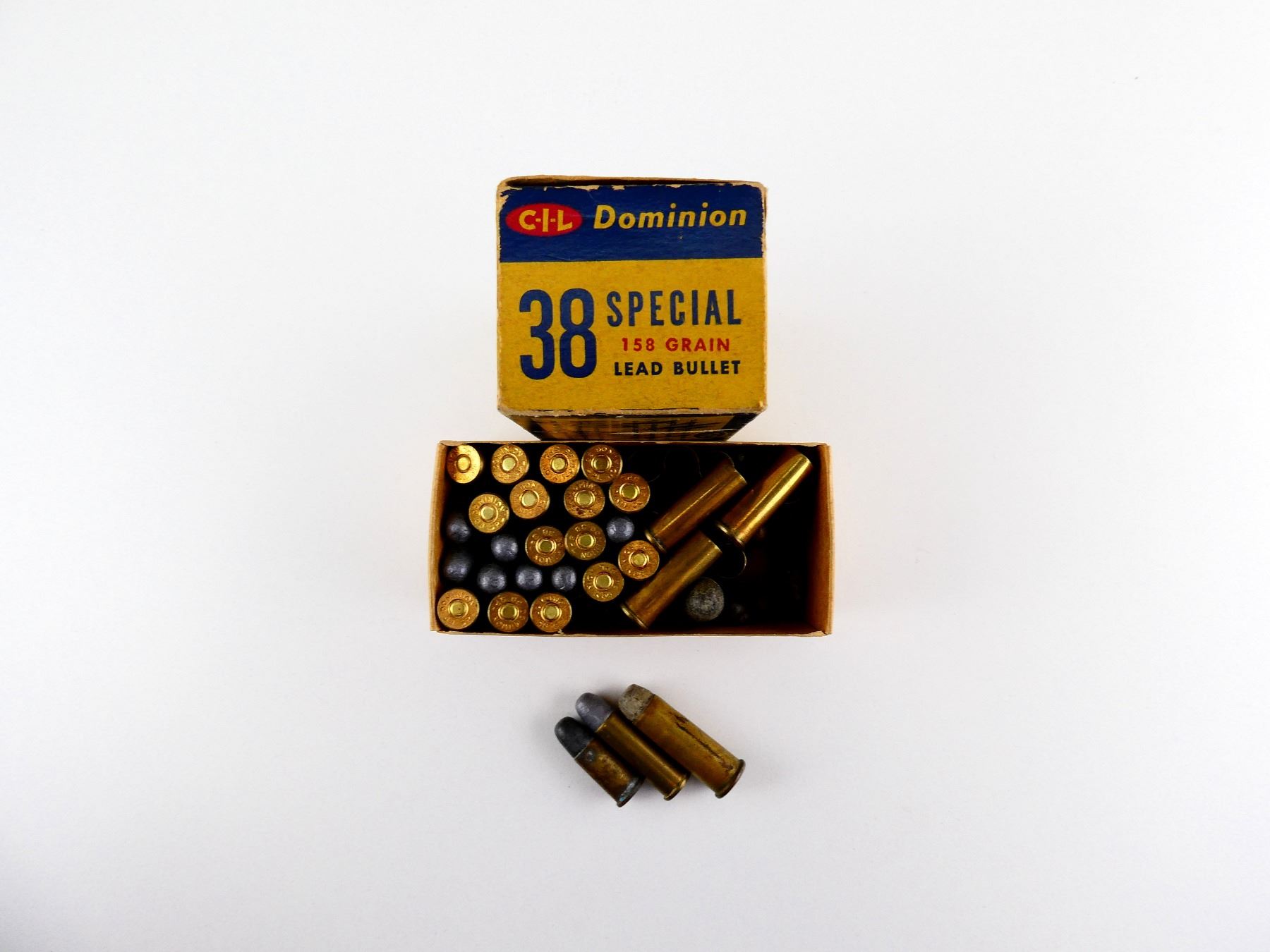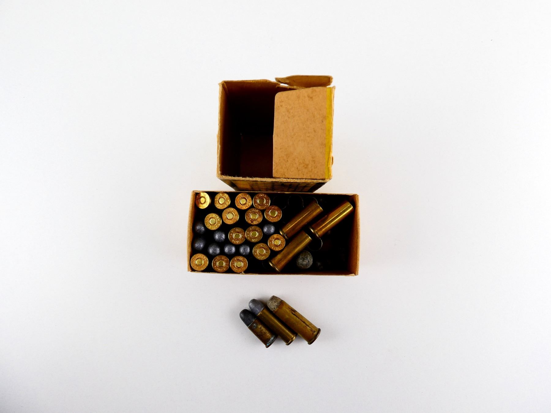 LOT INCLUDES; APPROX. (30) RNDS, VARIOUS CALIBERS INCLUDING; .38 S&W, .38 SPL, .41 SWISS, .32 SHORT RF, ETC., (17) NON-PRIMED BRASS CASES, IN COLLECTIBLE BOX, SHOWS SOME WEAR, SEE PHOTOS.