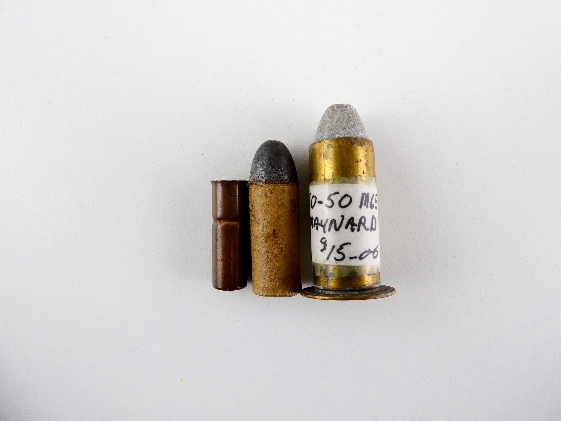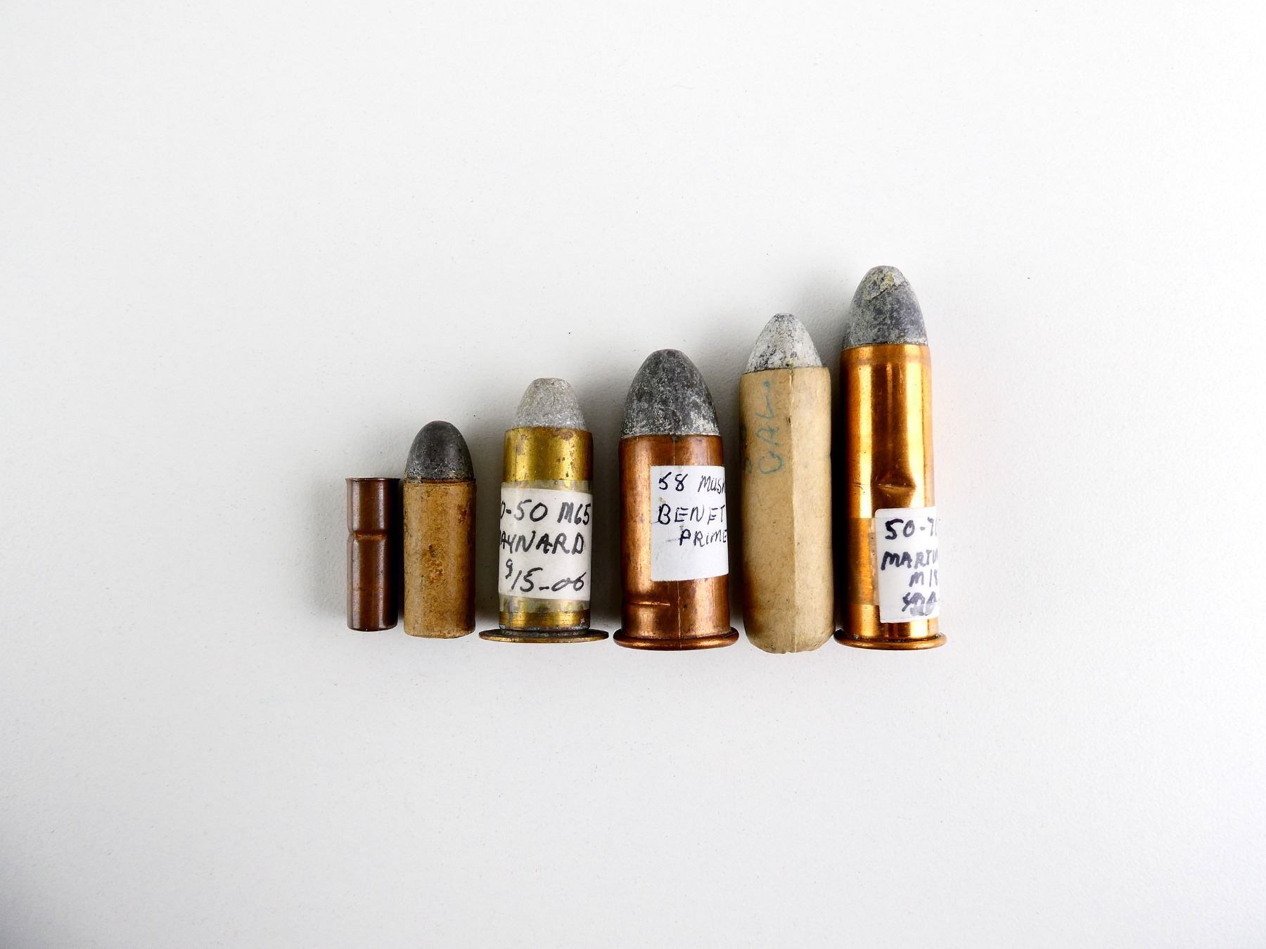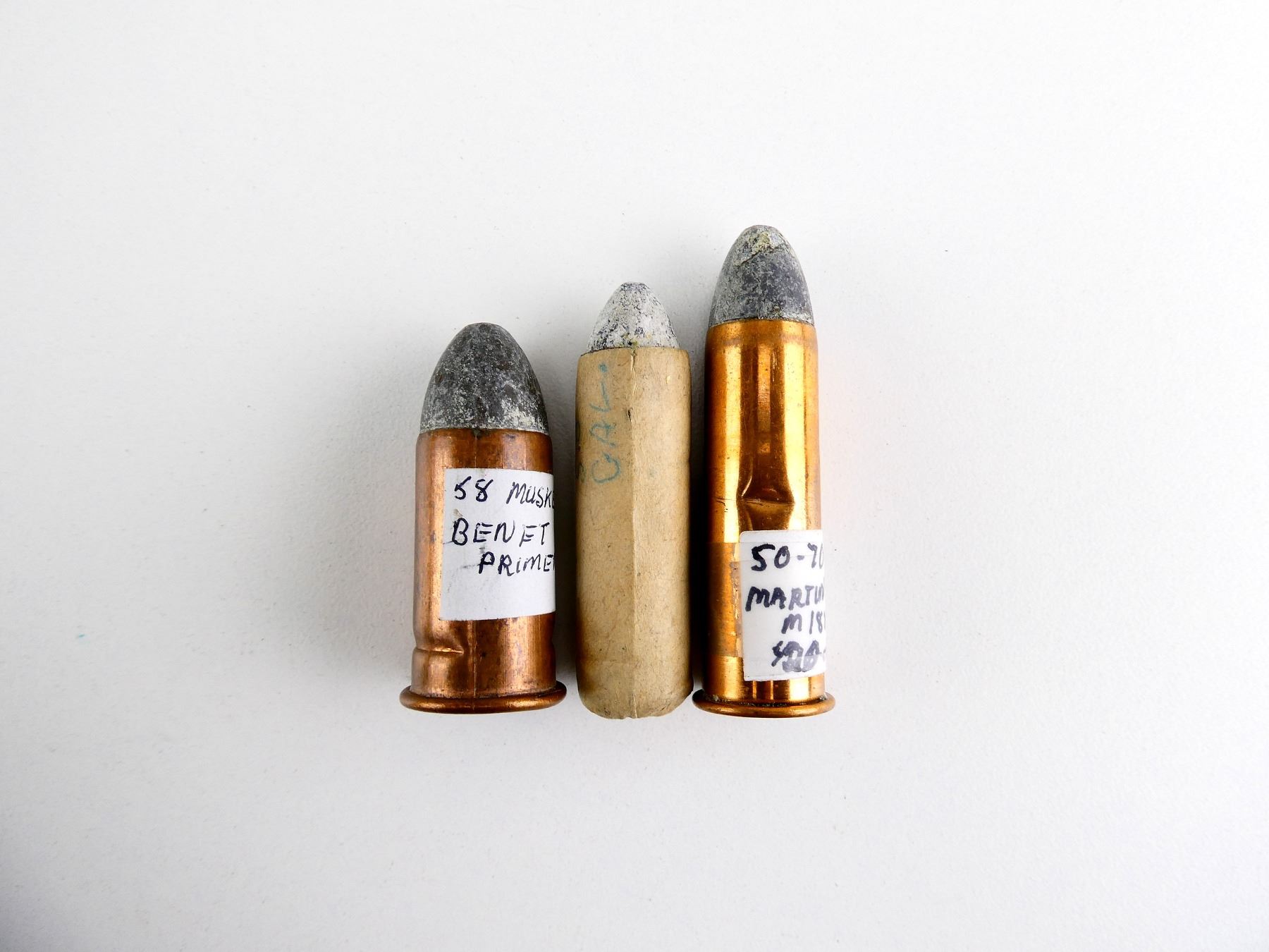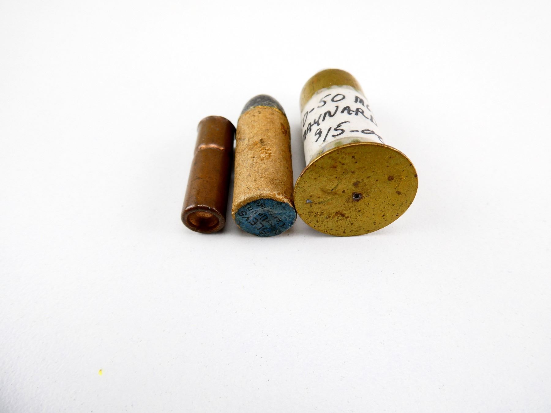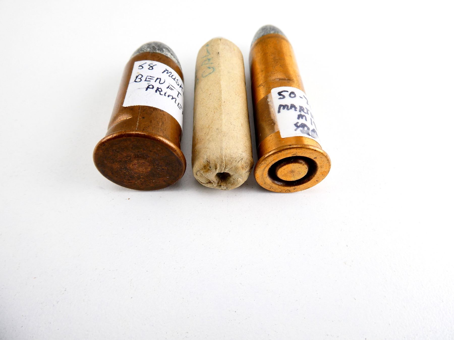 LOT INCLUDES; APPROX. (6) RNDS, VARIOUS CALIBERS INCLUDING; CUP FIRE APPROX. DIA.300", .50-50 MAYNARD, .50-70SPG MARTIN PRIMED, .58 MUSKET BENET PRIMED, .50 CALIBER PAPER WRAPPED RND, ETC., SEE PHOTOS.
