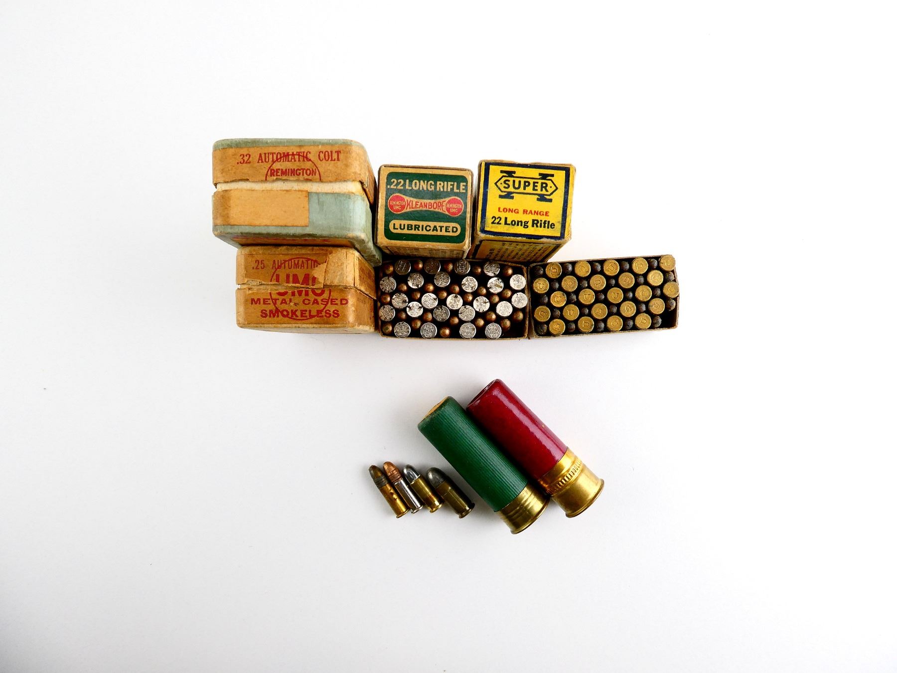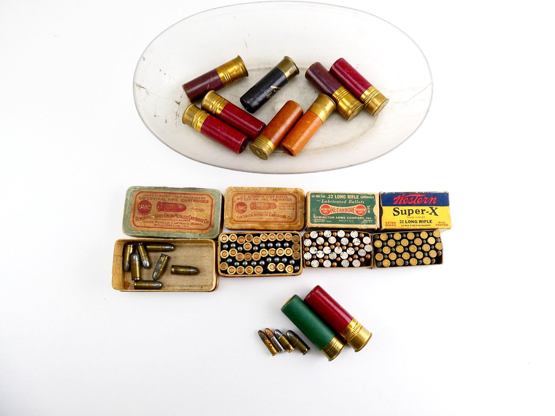 LOT INCLUDES; APPROX. (168) RNDS, VARIOUS MANUFACTURERS, ASSORTED CALIBERS INCLUDING; .22 LR, .25 AUTOMATIC COLT, .32 AUTO, 12 GAUGE 2 3/4" SHOT SHELL, ETC., SOME IN ORIGINAL COLLECTIBLE BOXES, SHOWS SOME WEAR, SEE PHOTOS.