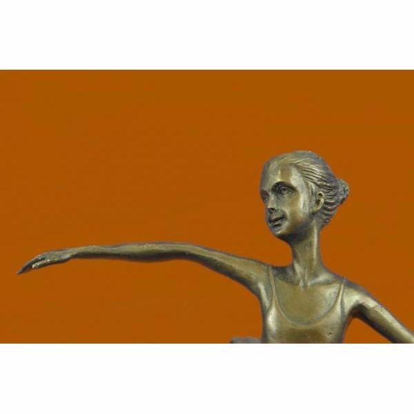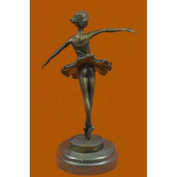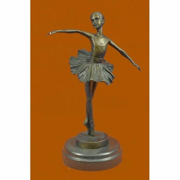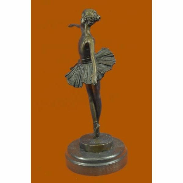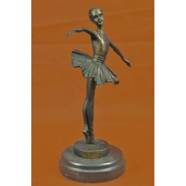 A prima ballerina puts on a show. Well trained in the art that she loves, she shows off her agility, balance and flexibility. She elevates her long leg far behind her. Her chest pushes out and her head tips up to the sky, basking in the glory of being center stage. Her spine curves, touching her back to her tutu. Her tutu spreads around her hips like a halo. Every movement is deliberate and structured, from the tips of her toes to the tips of her fingers. 100% bronze, this handmade brown patina sculpture was cast using the "Lost Wax Method" and mounted on a black marble base and is signed by artist Milo. Condition: this sculpture is in perfect condition. Bronze Dimensions with Marble Base:Height 10" X Width 7 " Marble Dimensions:Diameter 4.5" Height without base: 9" Weight : 4 LBS Inventory : 47YRD12222874