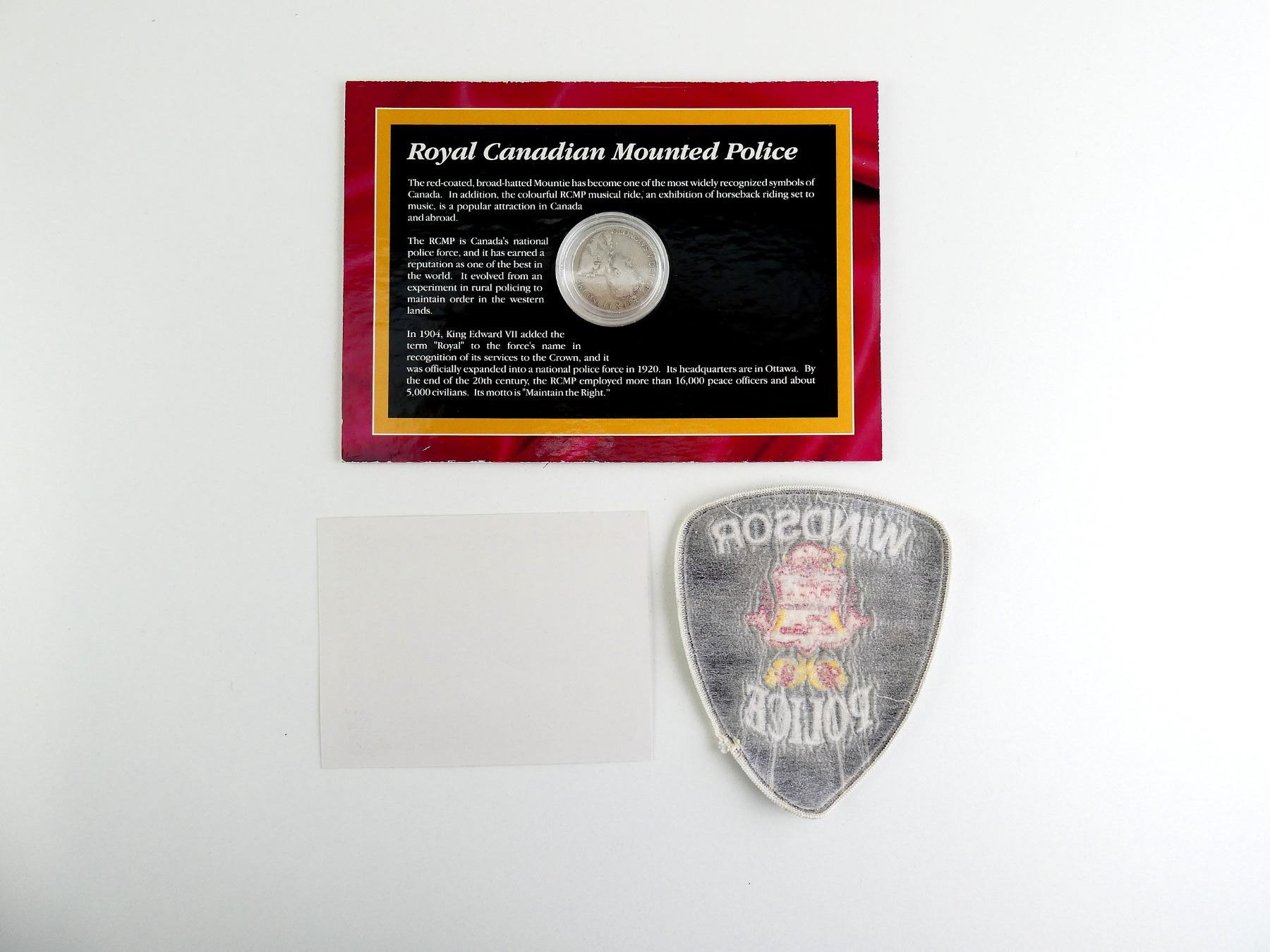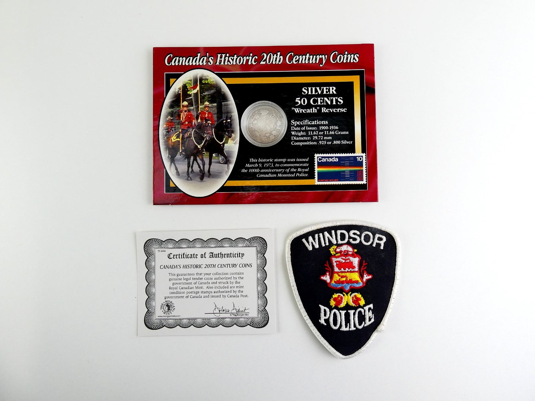 LOT INCLUDES; (1) SILVER 50 CENT COIN, DATED 1916, (1) STAMP COMMEMORATING THE 100TH ANNIVERSARY OF THE ROYAL CANADIAN MOUNTED POLICE, ISSUED MARCH 9TH 1973, ALL IN PROTECTIVE CASE WITH INFORMATION ABOUT COIN / STAMP / ROYAL CANADIAN MOUNTED POLICE, WITH CERTIFICATE OF AUTHENTICITY & (1) CANADIAN WINDSOR POLICE BADGE. SEE PHOTOS.