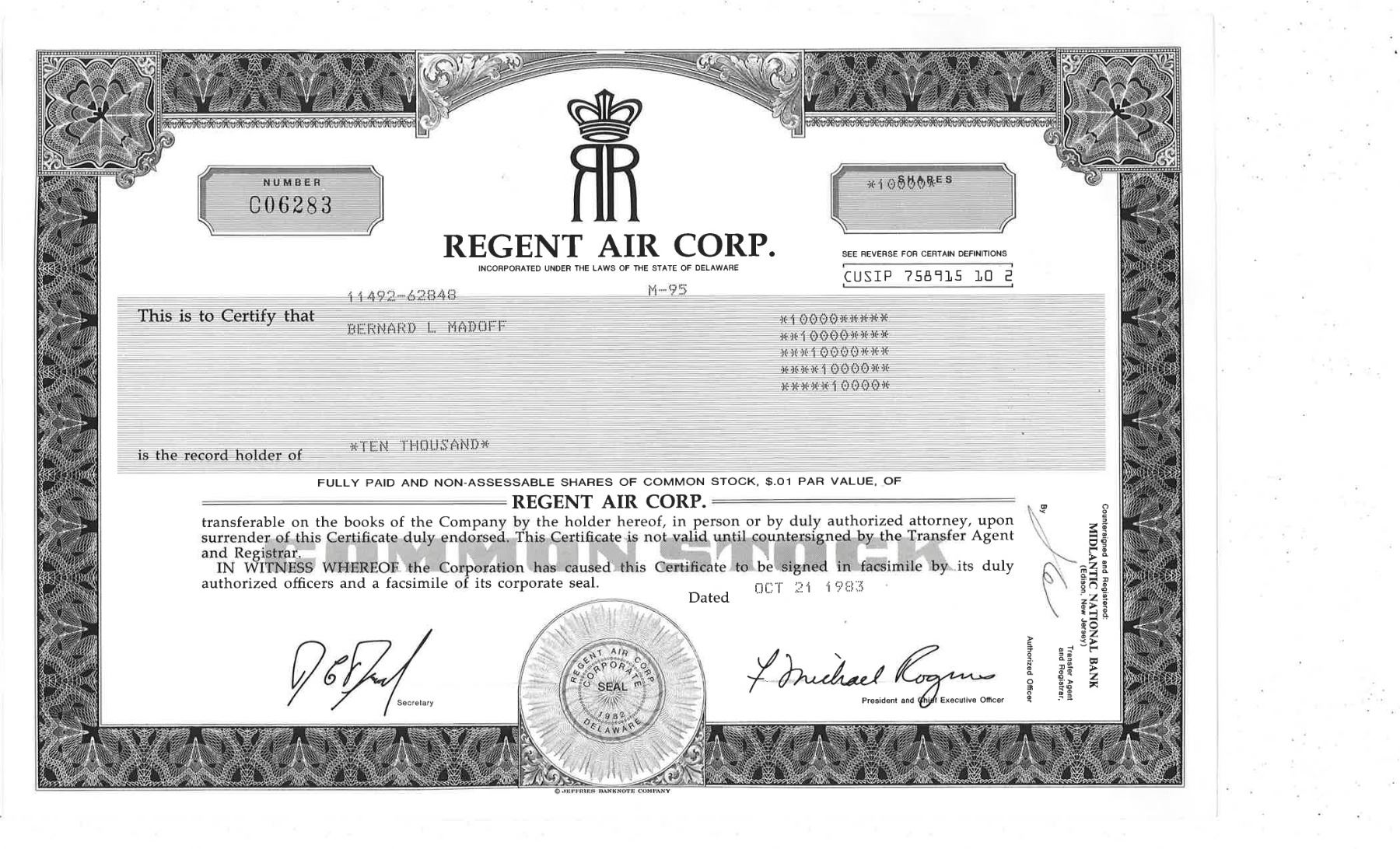 COLLECTIBLE CERTIFICATE: 10,000 shares of Regent Air Corp stock registered owner name Bernard L Madoff CUSIP 758915 10 2. Number C06283