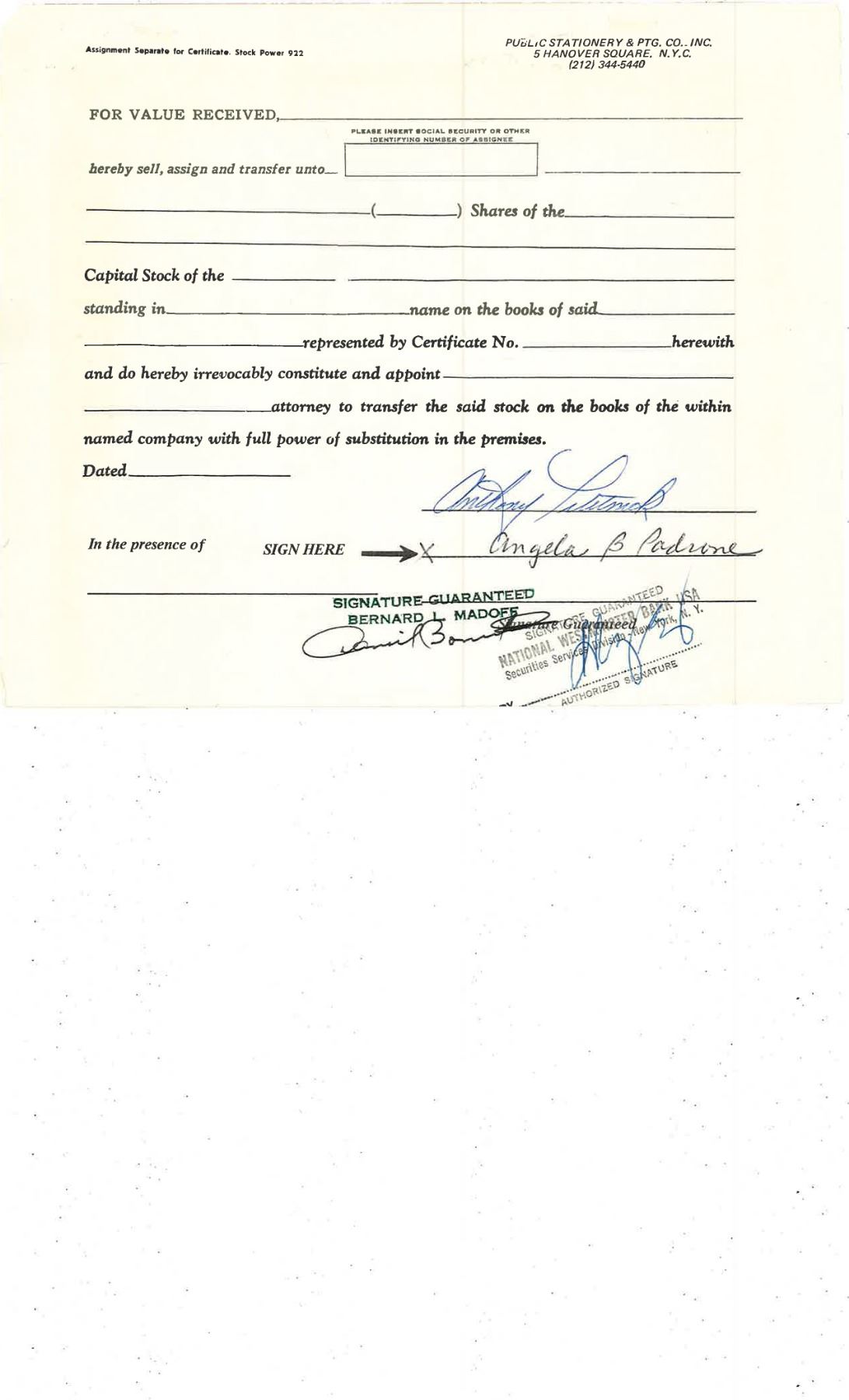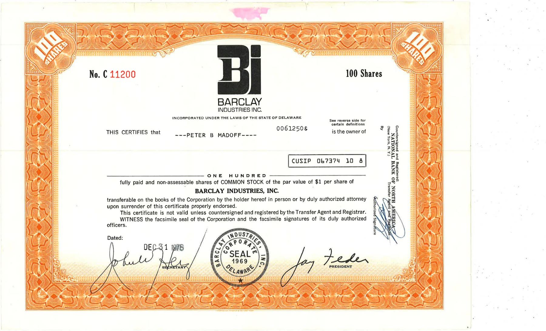 COLLECTIBLE CERTIFICATE: 100 shares of Barclay Industries Inc Stock registered owner name Peter B Madoff CUSIP 067374 10 8. Number C 11200