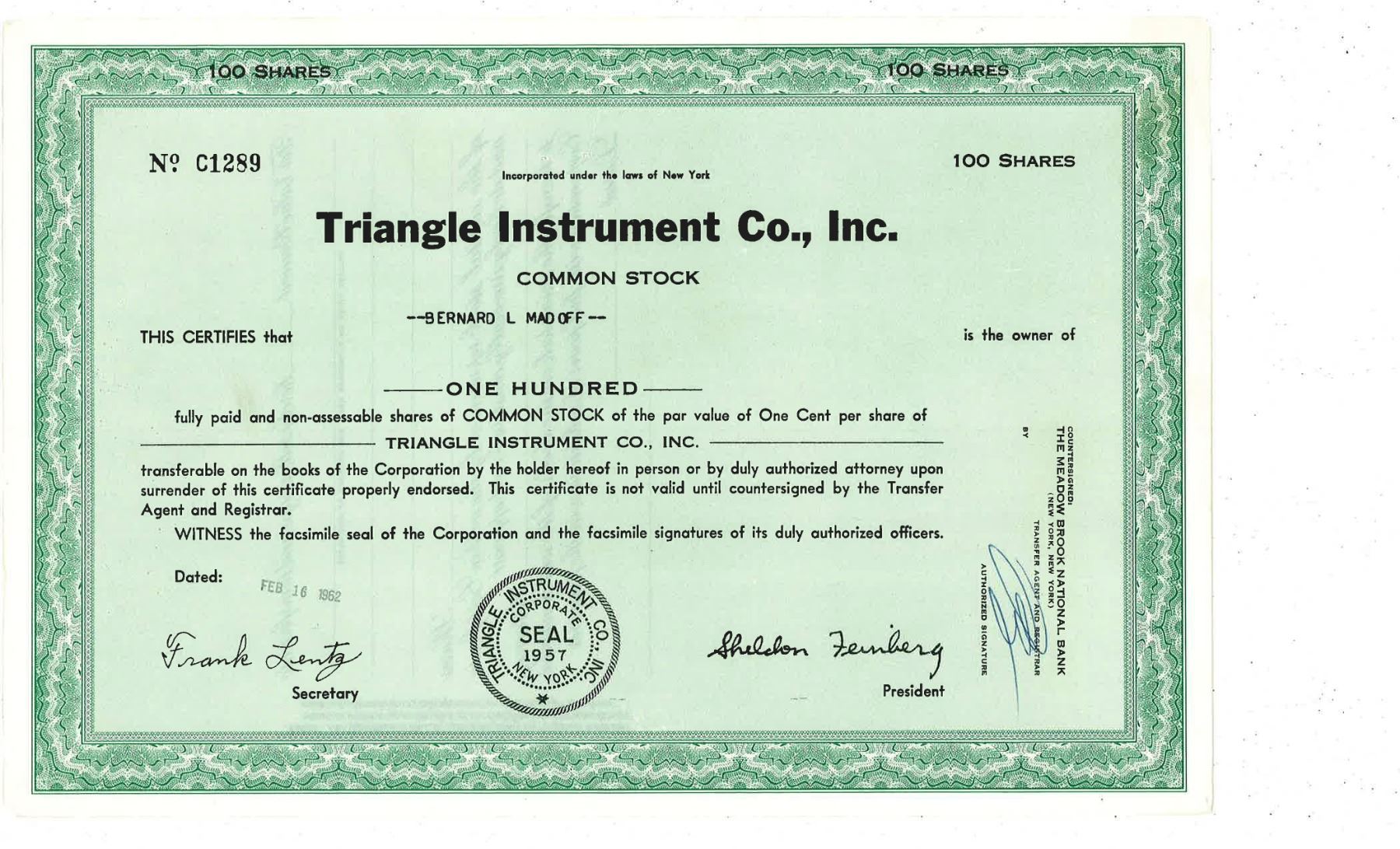 COLLECTIBLE CERTIFICATE: 100 shares of Triangle Instrument Co Inc stock registered owner name Bernard L Madoff. Number C1289