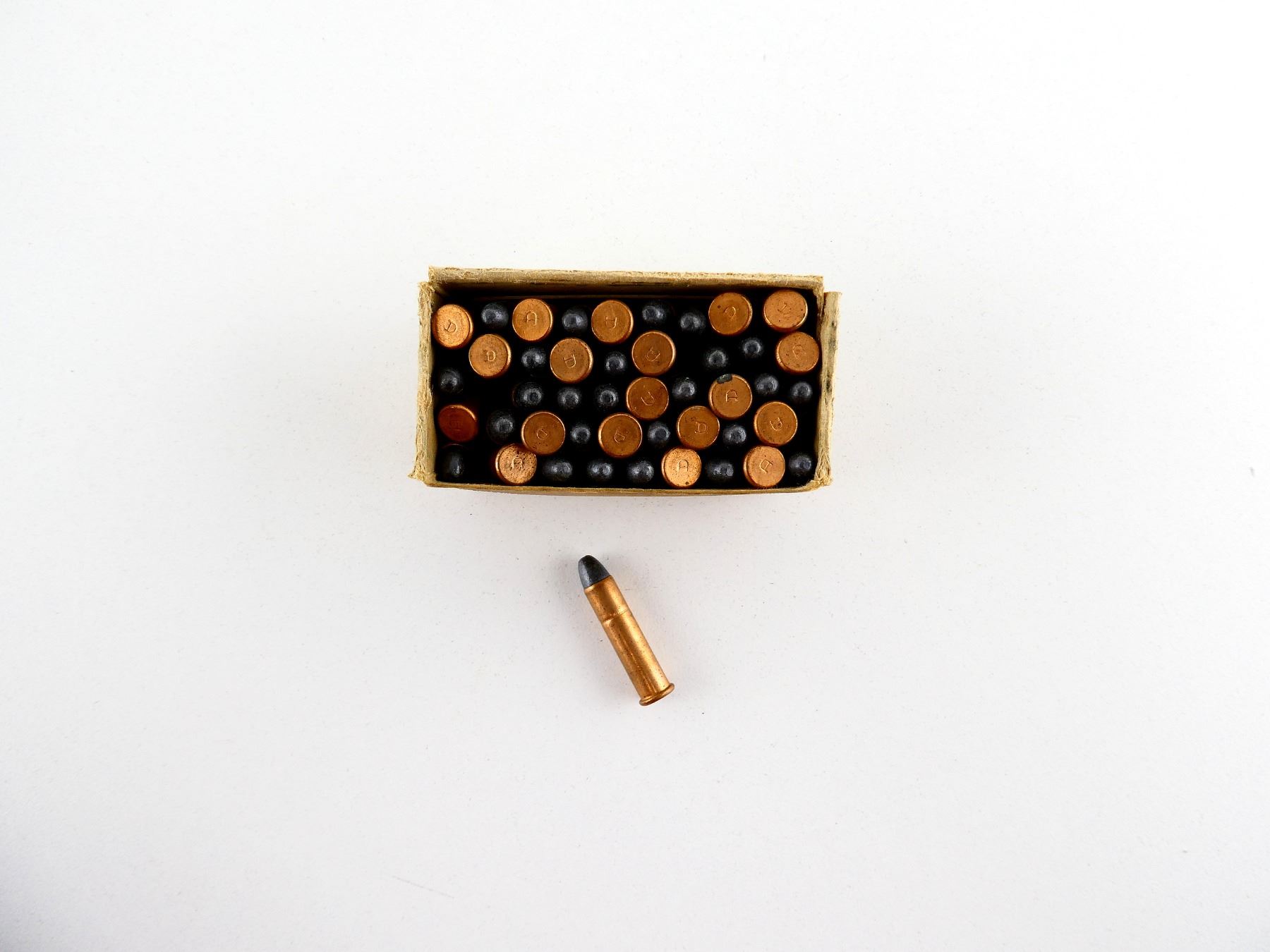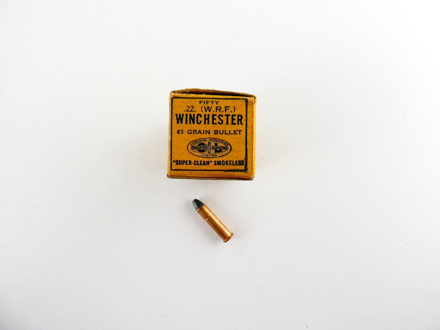 LOT INCLUDES; APPROX. (45) RNDS, 45 GRNS (STATED ON BOX NOT CONFIRMED), LEAD BULLET, IN ORIGINAL COLLECTIBLE BOX, SHOWS SOME WEAR, SEE PHOTOS.