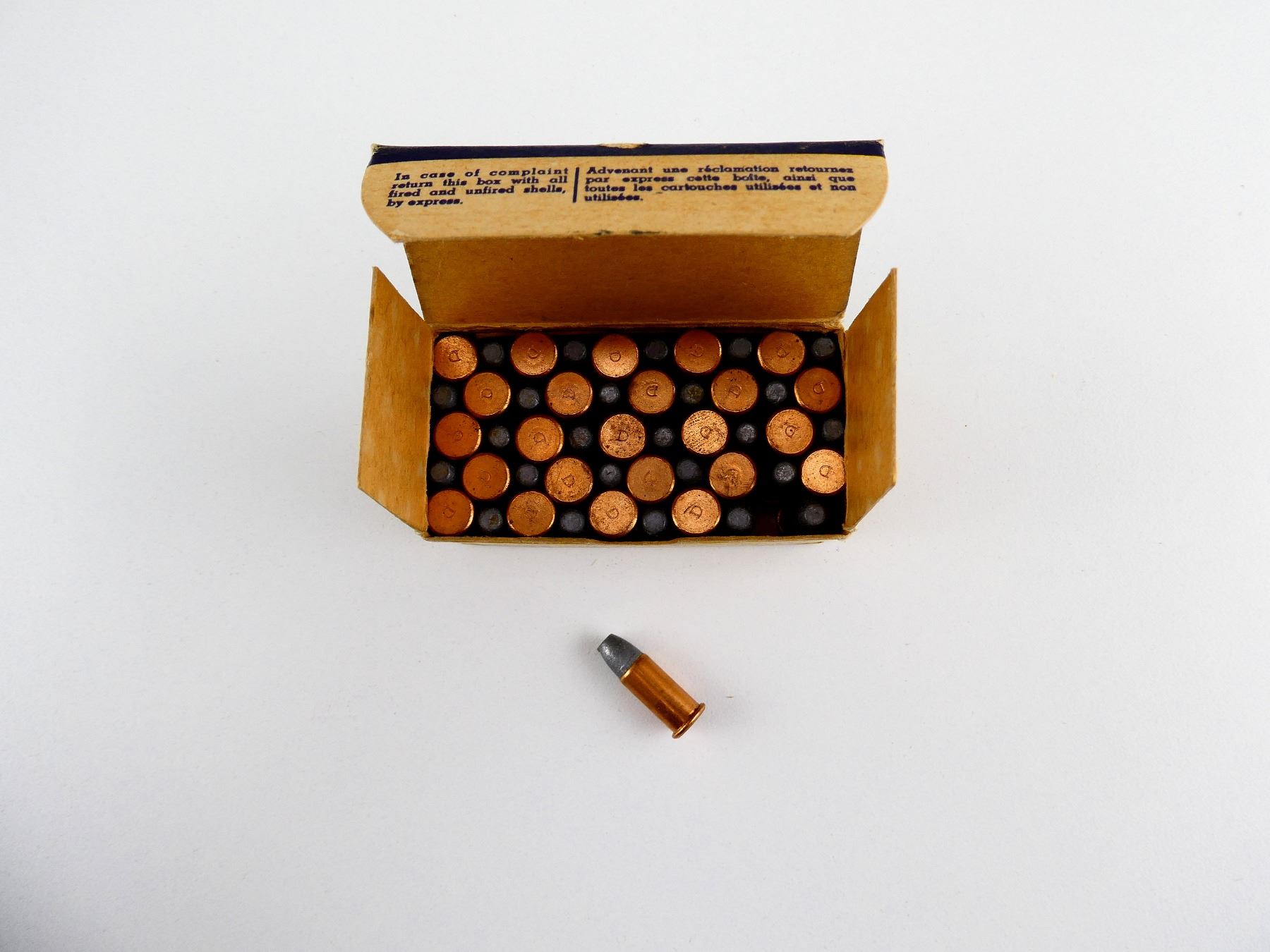 LOT INCLUDES; APPROX. (50) RNDS, 65 GRNS (STATED ON BOX NOT CONFIRMED), BULLET, IN ORIGINAL COLLECTIBLE BOX, SHOWS SOME WEAR, SEE PHOTOS.