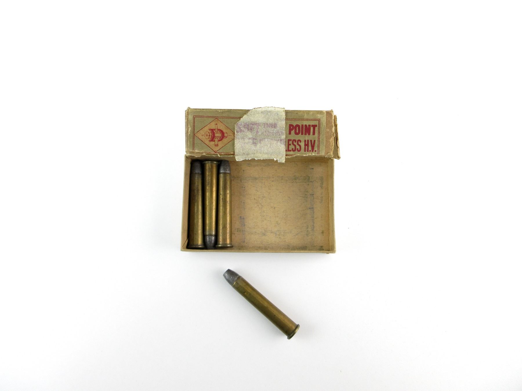 LOT INCLUDES; APPROX. (4) RNDS, SP, SMOKELESS HIGH VELOCITY, IN ORIGINAL COLLECTIBLE BOX, SHOWS SOME WEAR, SEE PHOTOS.