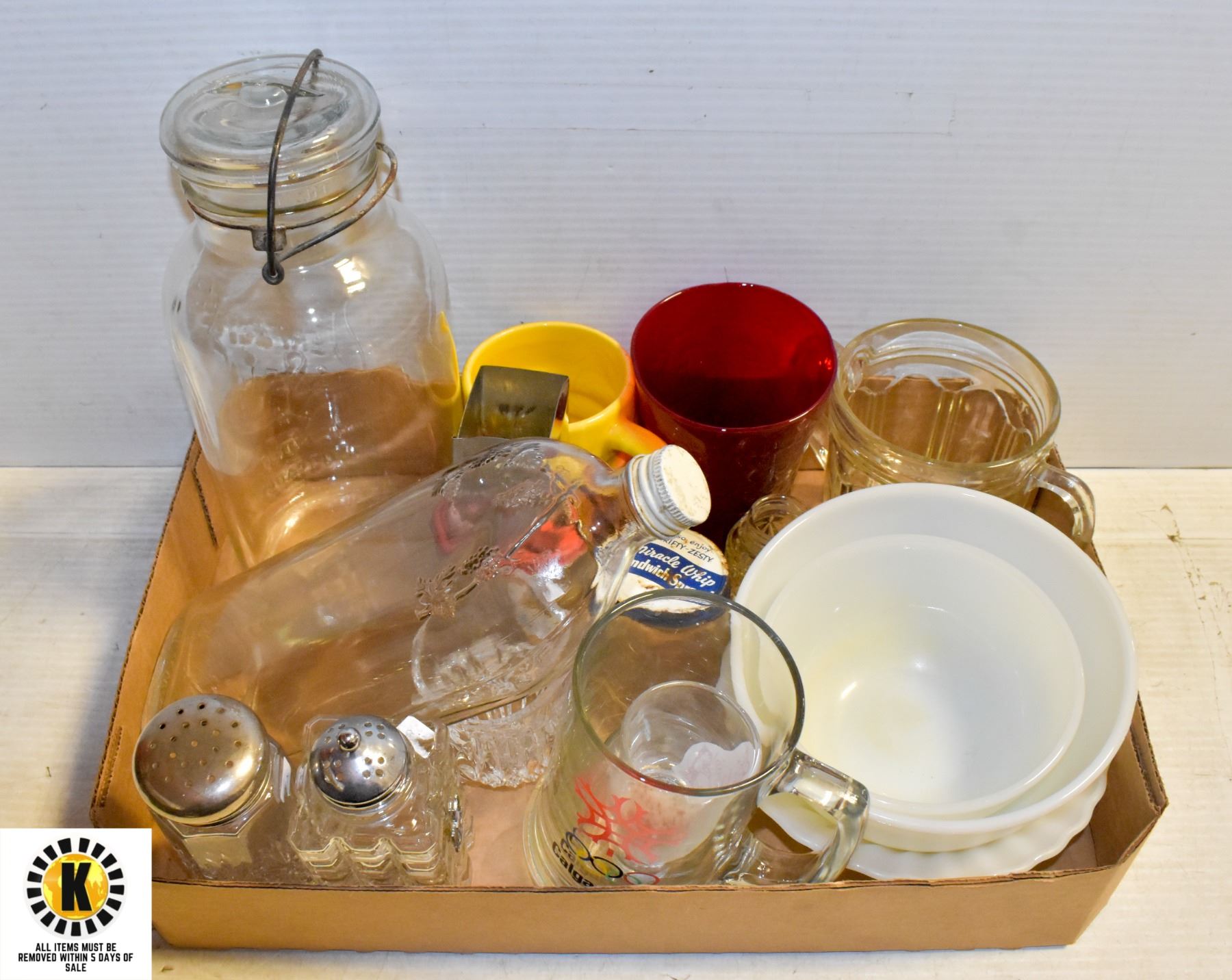 COLLECTIBLE GLASS BOTTLES, JARS, FIRE KING