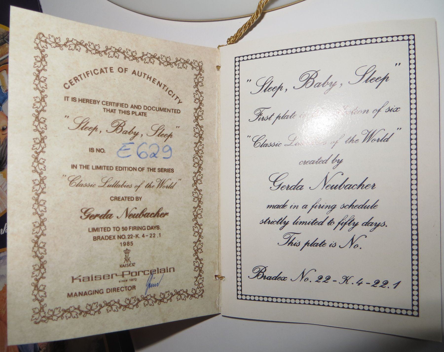 COLLECTIBLE PLATE (BRADEX) *SLEEP BABY SLEEP* (GENUINE KAISER PORCELAIN-7 3/4" WIDE) *NIB*