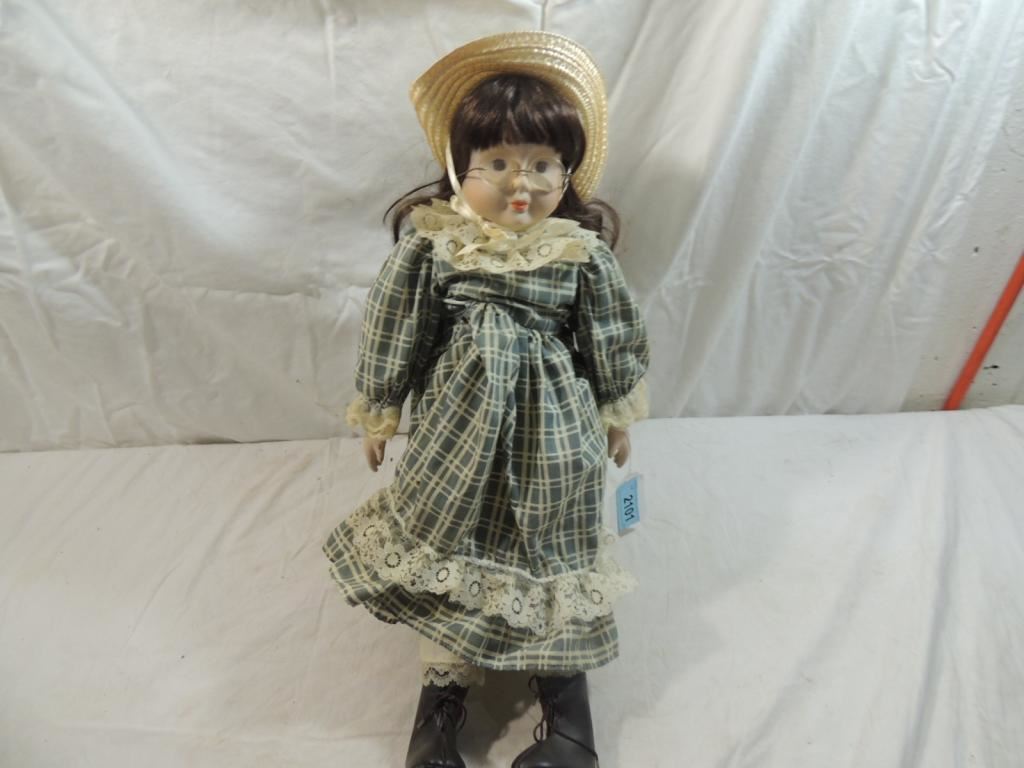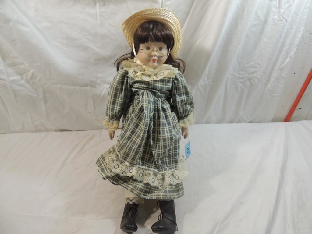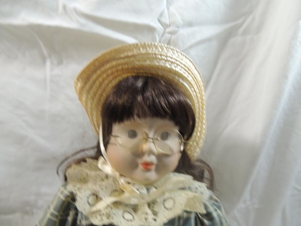 PORCELAIN HANDS AND HEAD, GLASSES, STRAW HAT, LACE DETAIL ALONG DRESS, AS SHOWN SEE PHOTO FOR MORE DETAILS.